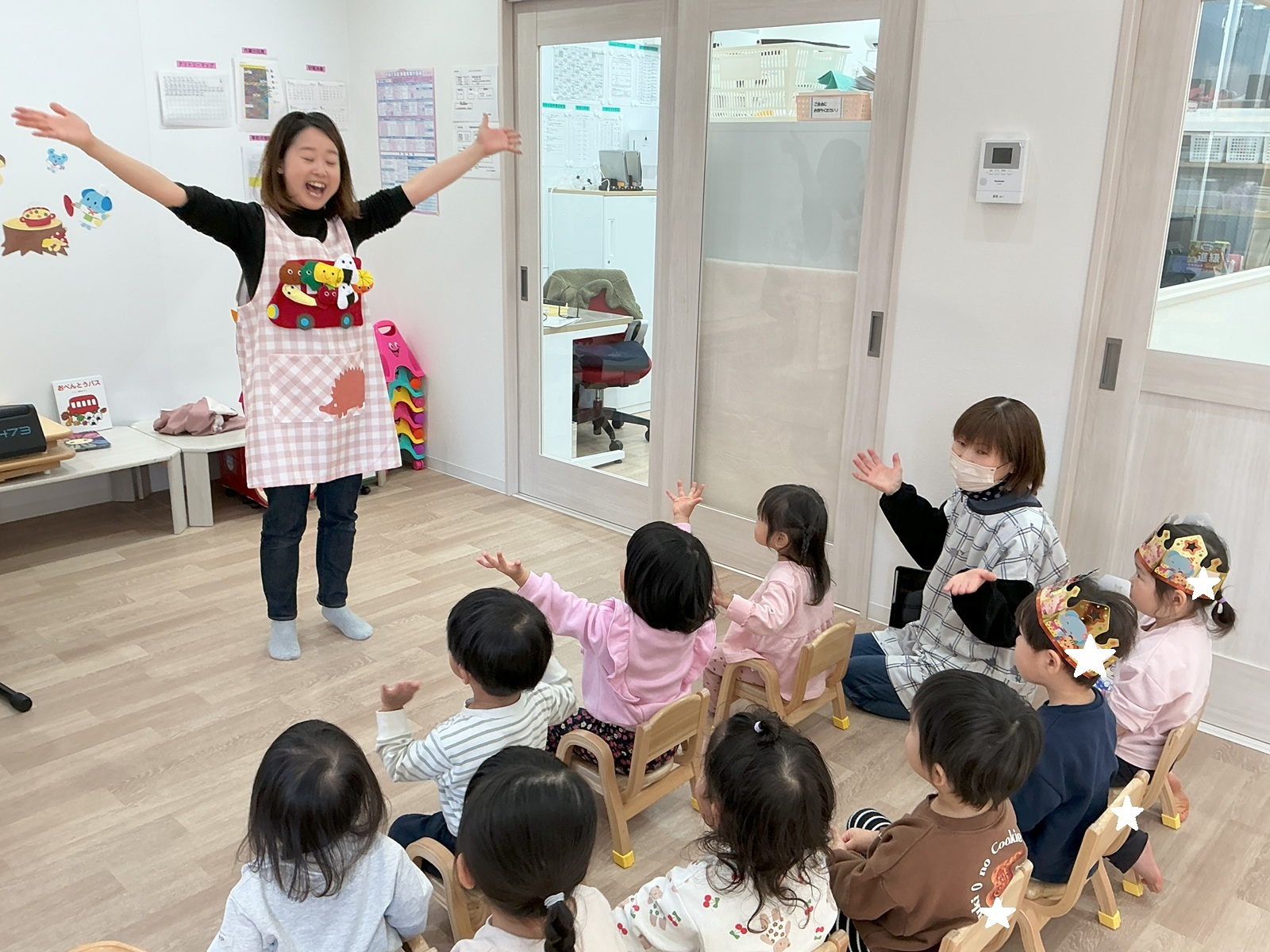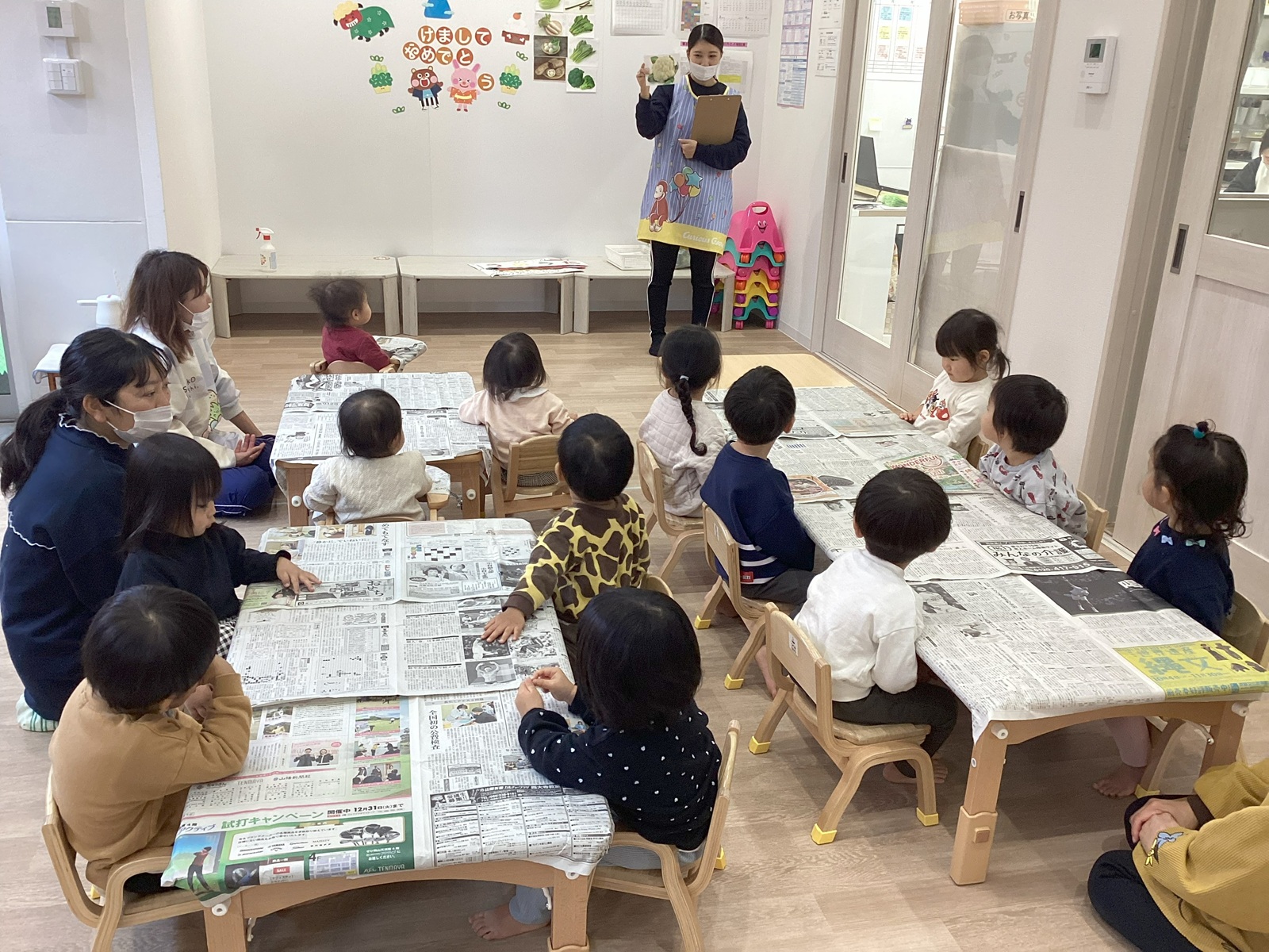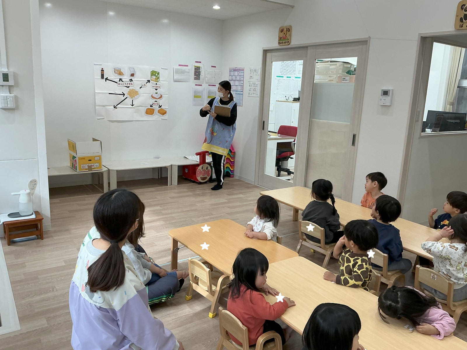 今月の先生の出し物は「おべんとうバス」のエプロンシアターです☆みんなで一緒に『ぎゅっぎゅっぎゅ~』