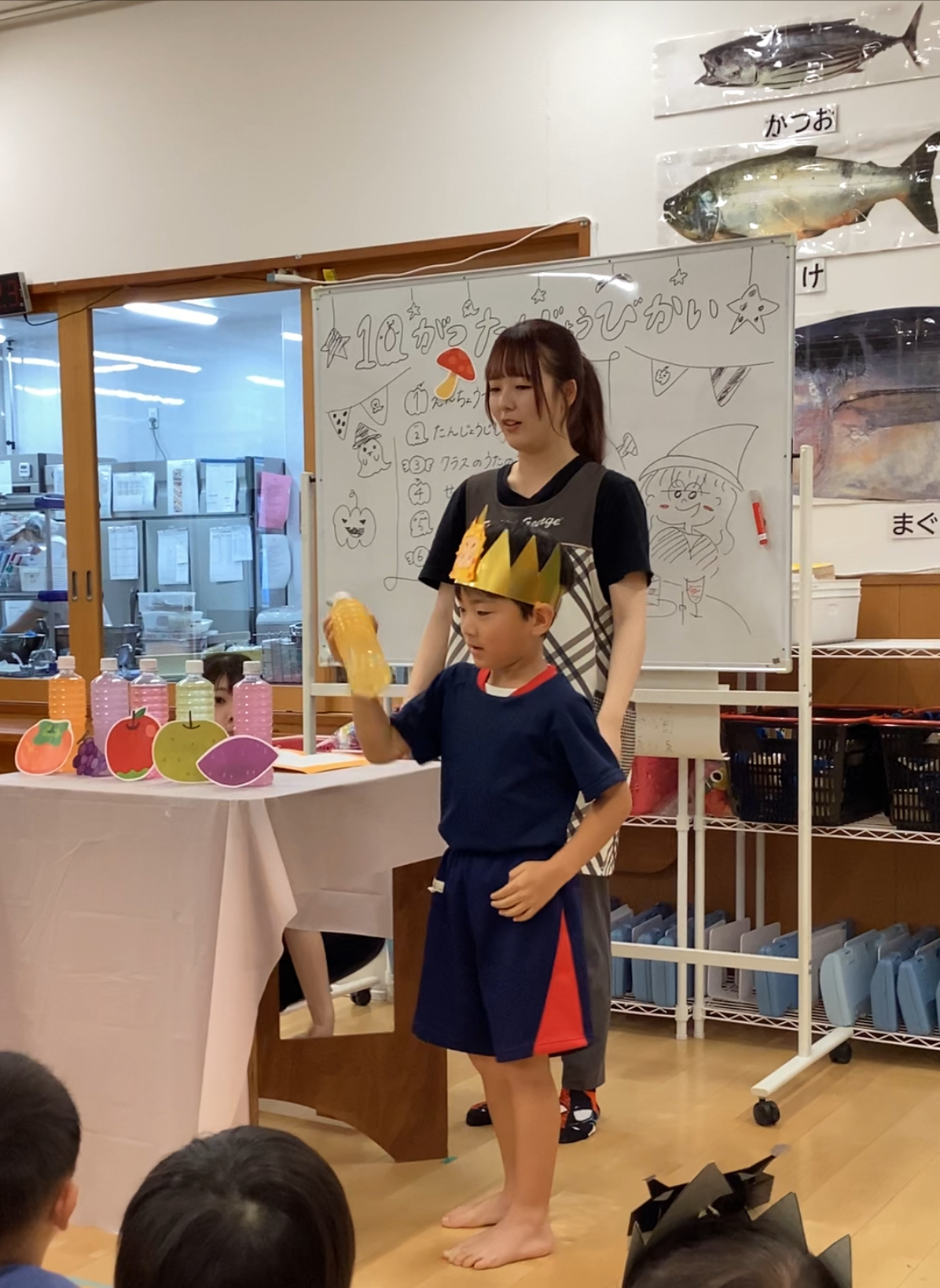 先生の出し物では、秋の食べ物クイズを楽しみました!クイズを聞いて、何の果物かを当てたあと、ペットボトルを振ってジュースを作りました✨