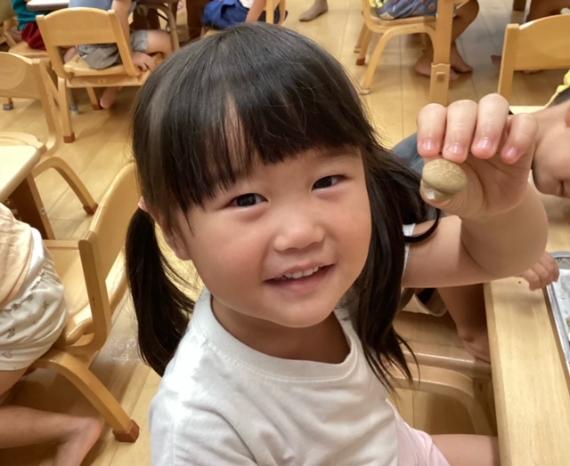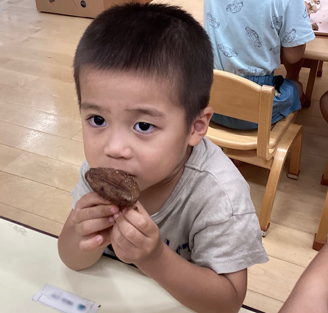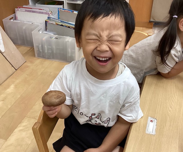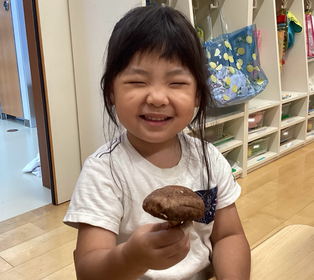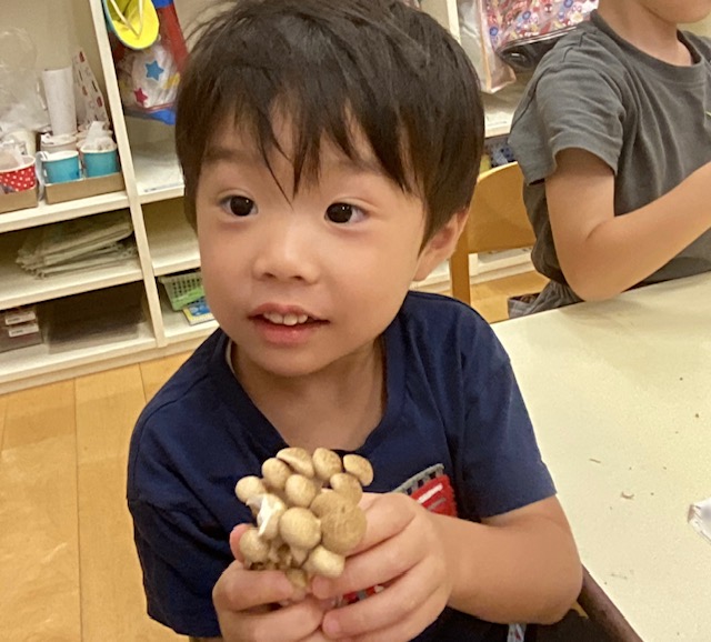 - 普段なかなか触れることのないきのこに興味津々で、楽しそうに触ったりにおってみたりしていました。秋の味覚に触れる活動は、子ども達が自然の恵みや季節の変化を感じ、食への関心を深める貴重な機会です。食育活動を通して、食材と出会い、親しむことで、食べることの楽しさやありがたさを学んでいってほしいです。
