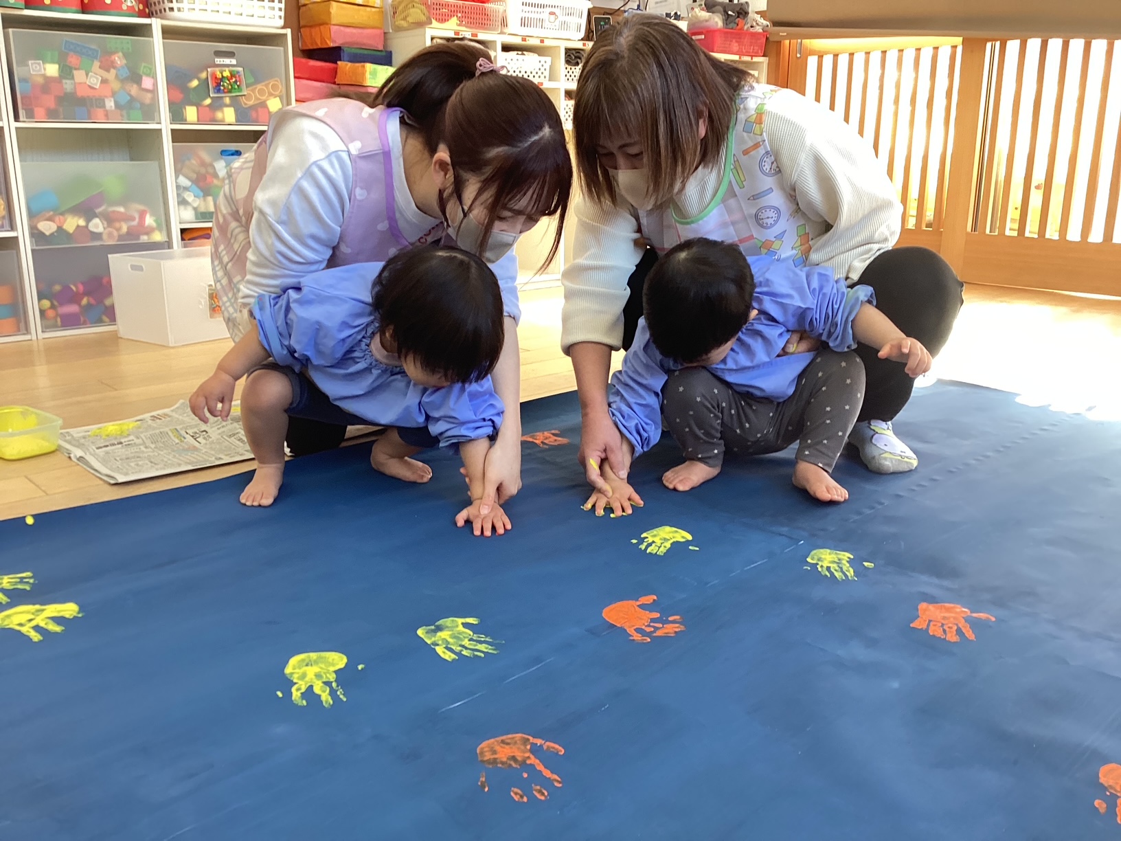 「ぼくたちの手みてみてー✨」黄色、オレンジ色、色もしっかりわかるようになりました