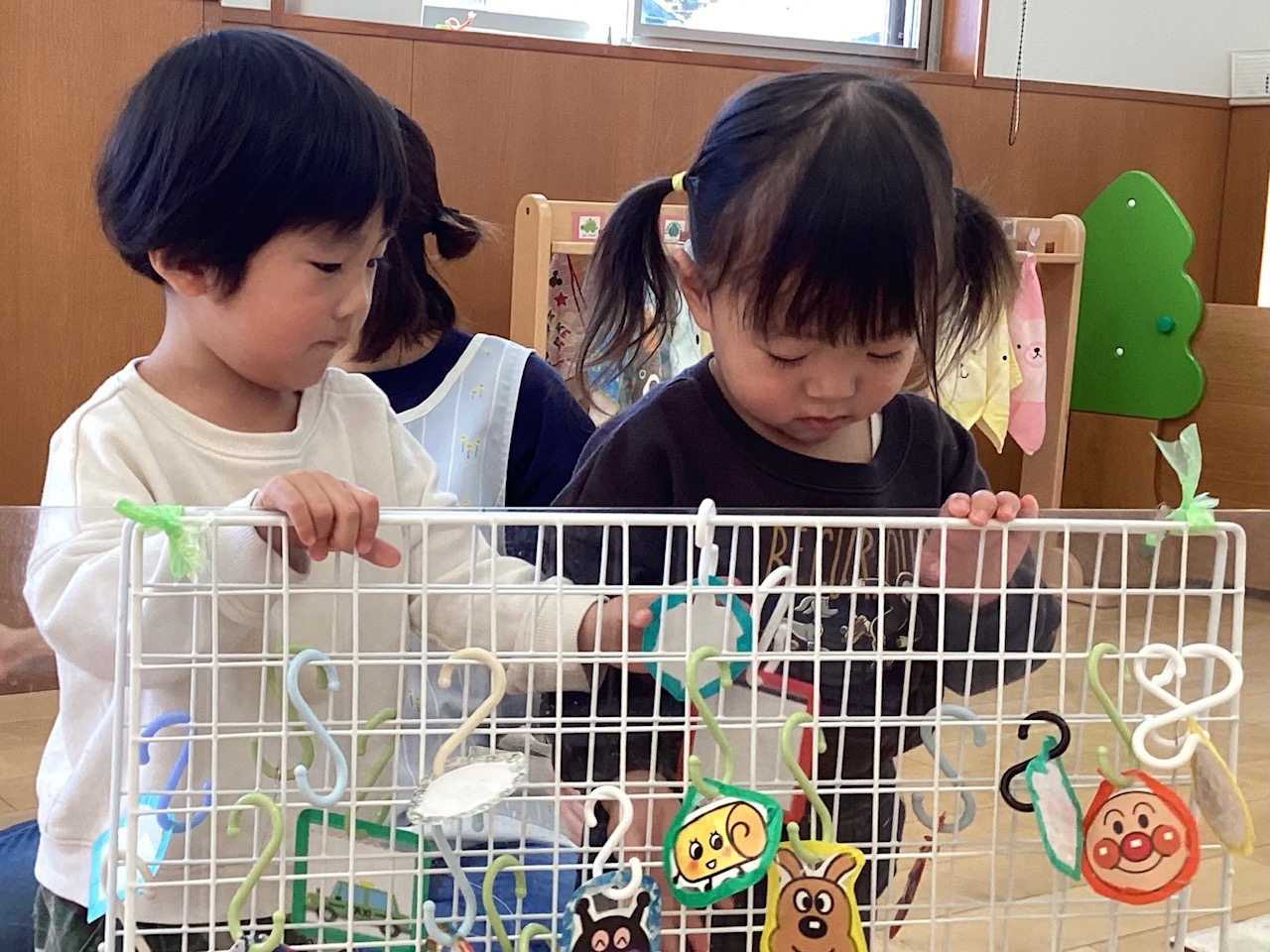 S字フックで遊びました。集中していっしょうけんめいかけています! 自分の好きなカードを見つけてかけていきます✨