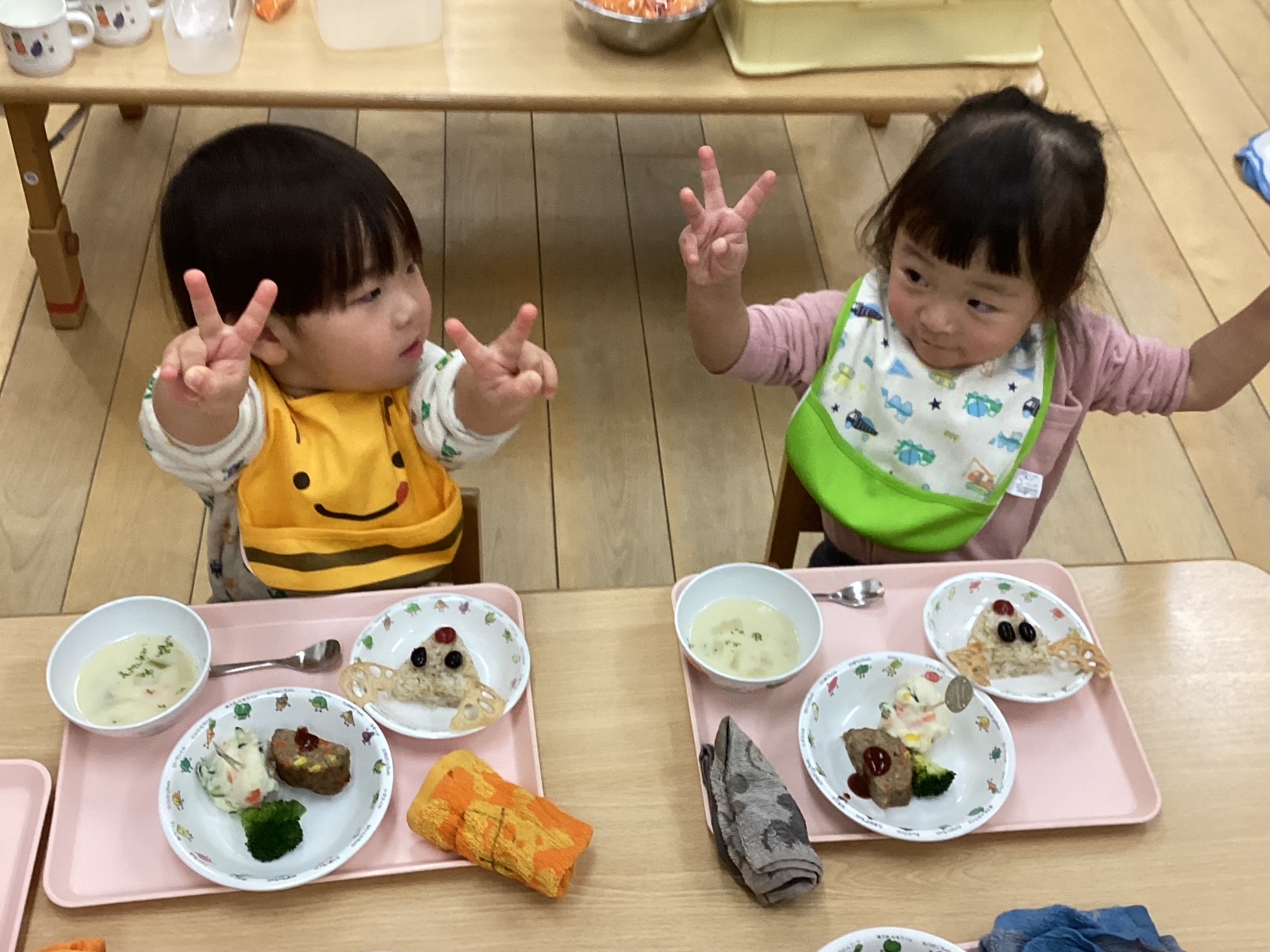給食はクリスマスメニュー「トナカイさんのおにぎりだー」すごくうれしそうに食べていました✌️