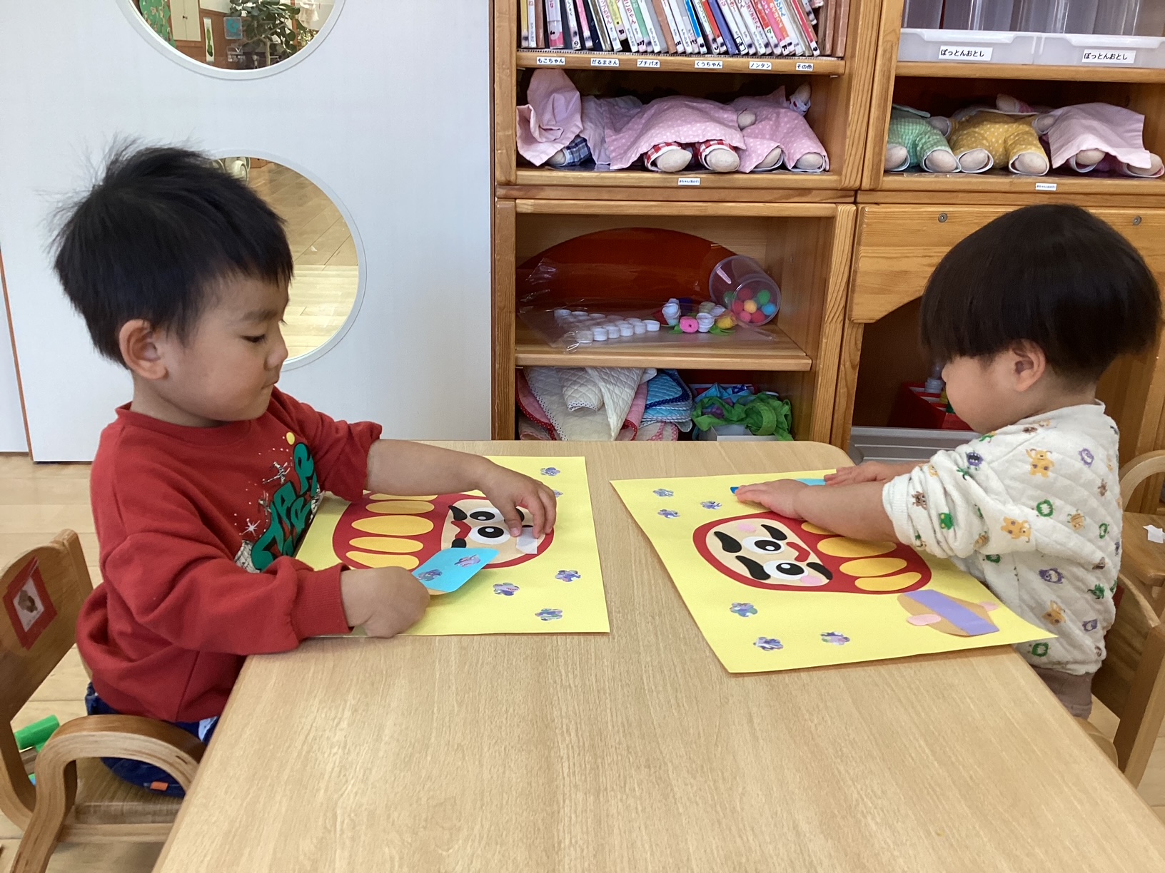 お正月の製作「だるま」とっても個性的な作品が仕上がりました♪ 自分の顔の目、眉毛を確かめながら丁寧に貼っていきましたよ