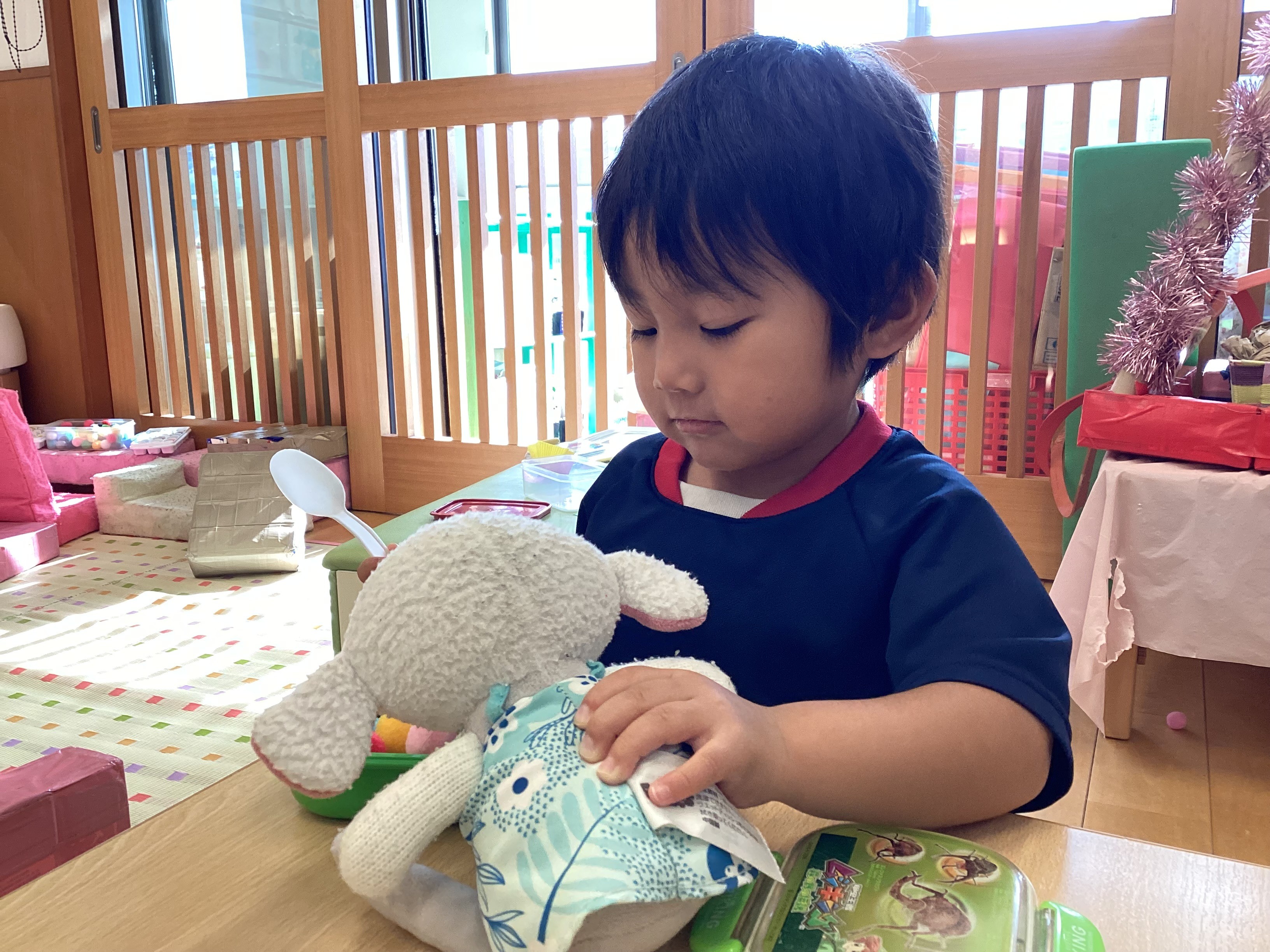 「お人形さんご飯どうぞ」とご飯を食べさせてあげています