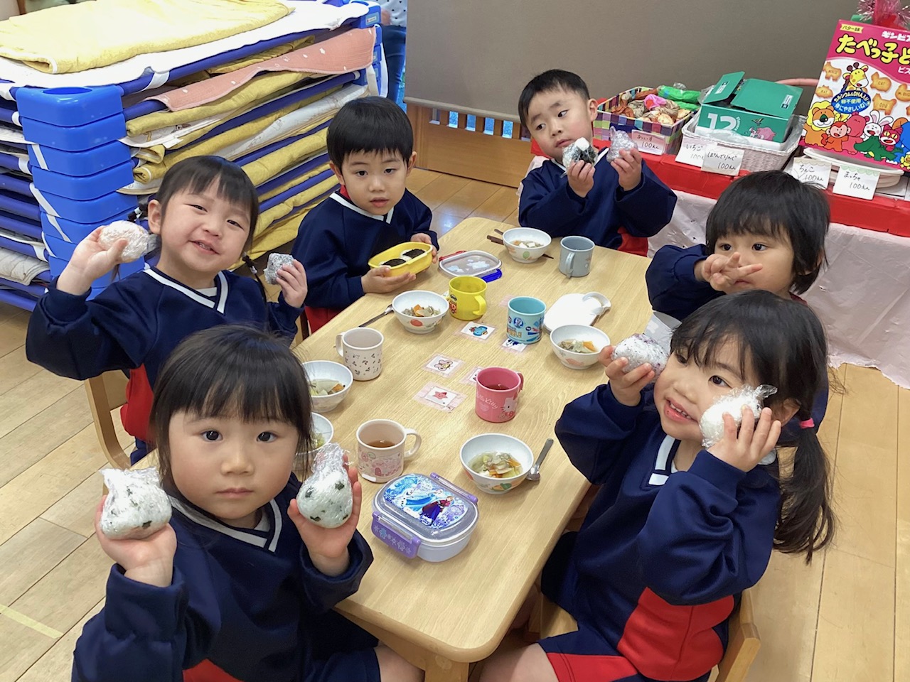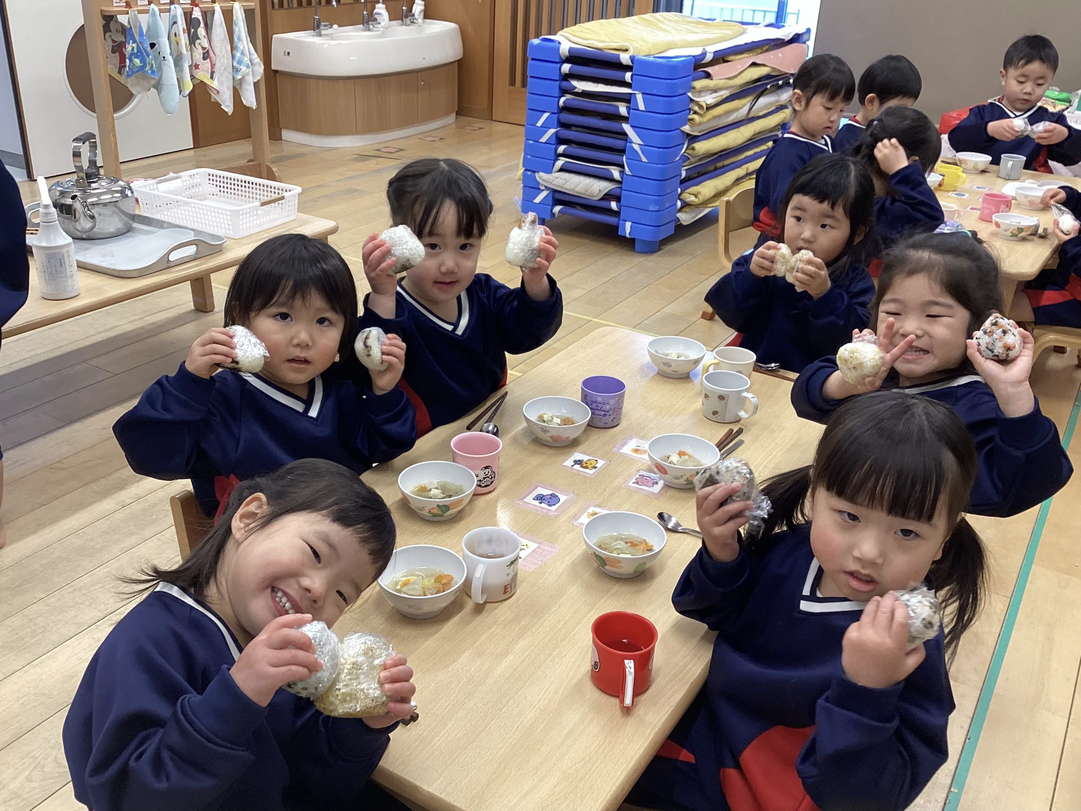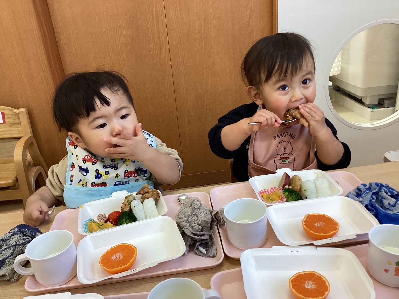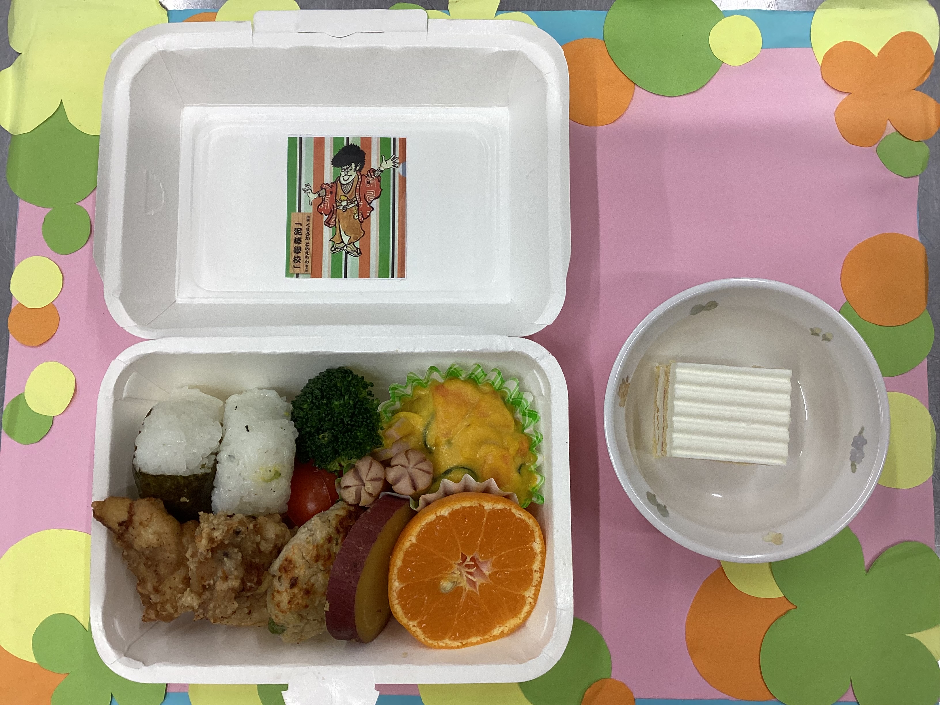給食 ・おにぎり ・鶏肉の唐揚げ ・つくね ・かぼちゃサラダ ・さつまいもの甘煮 ・ウインナー ・ミニトマト ・ブロッコリー ・みかん 昼おやつ ・ケーキ