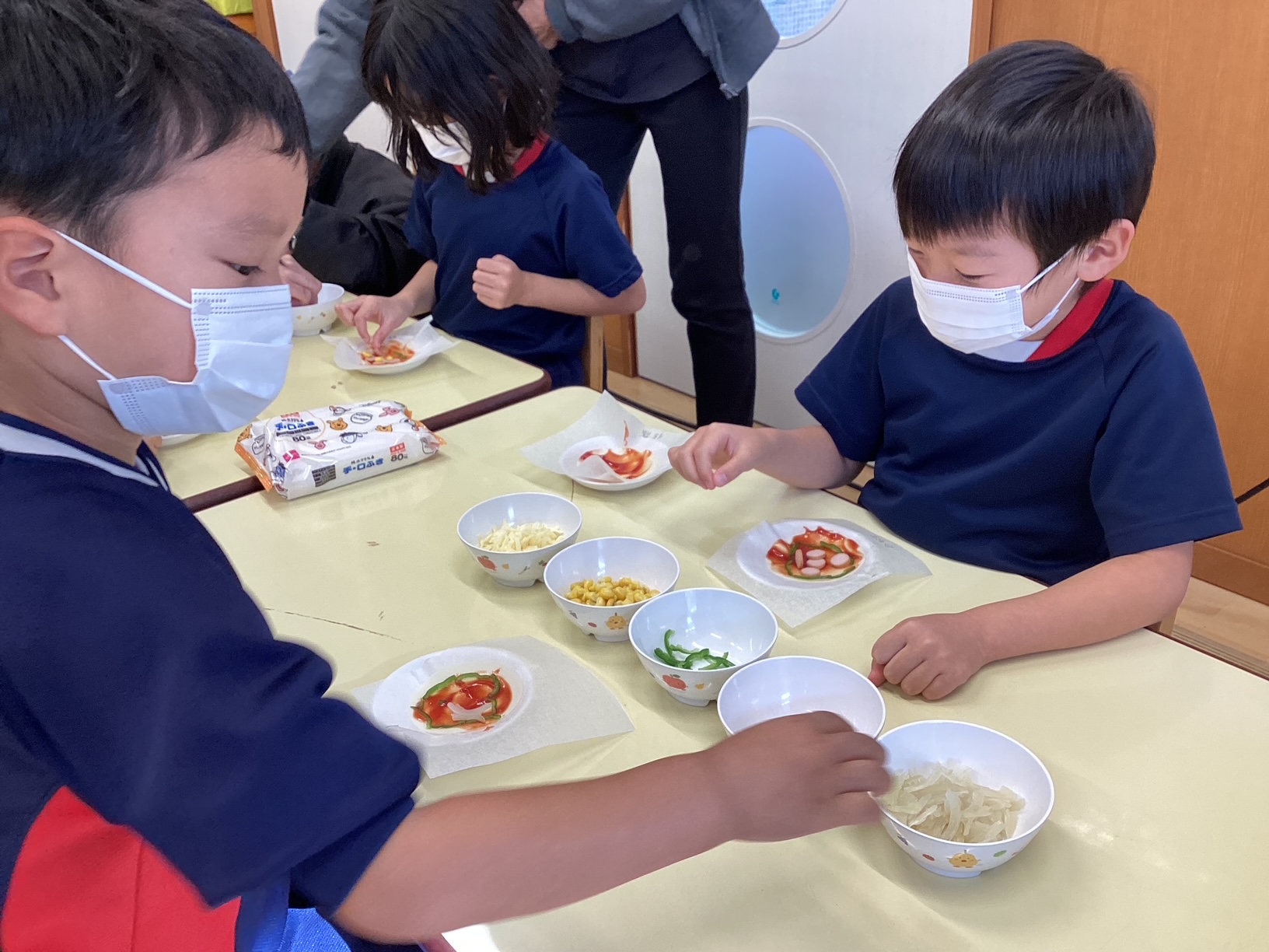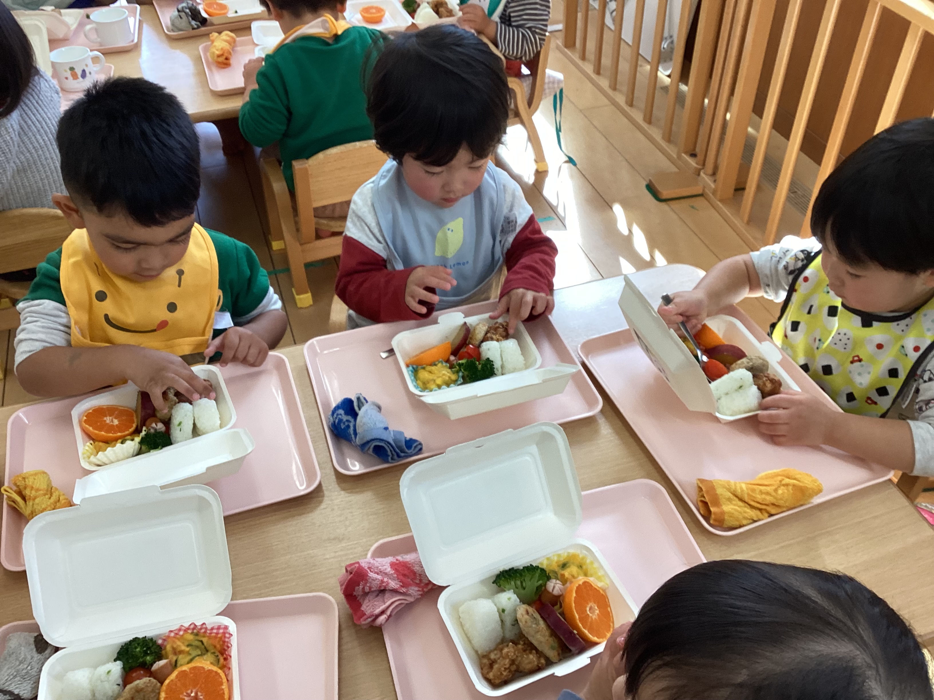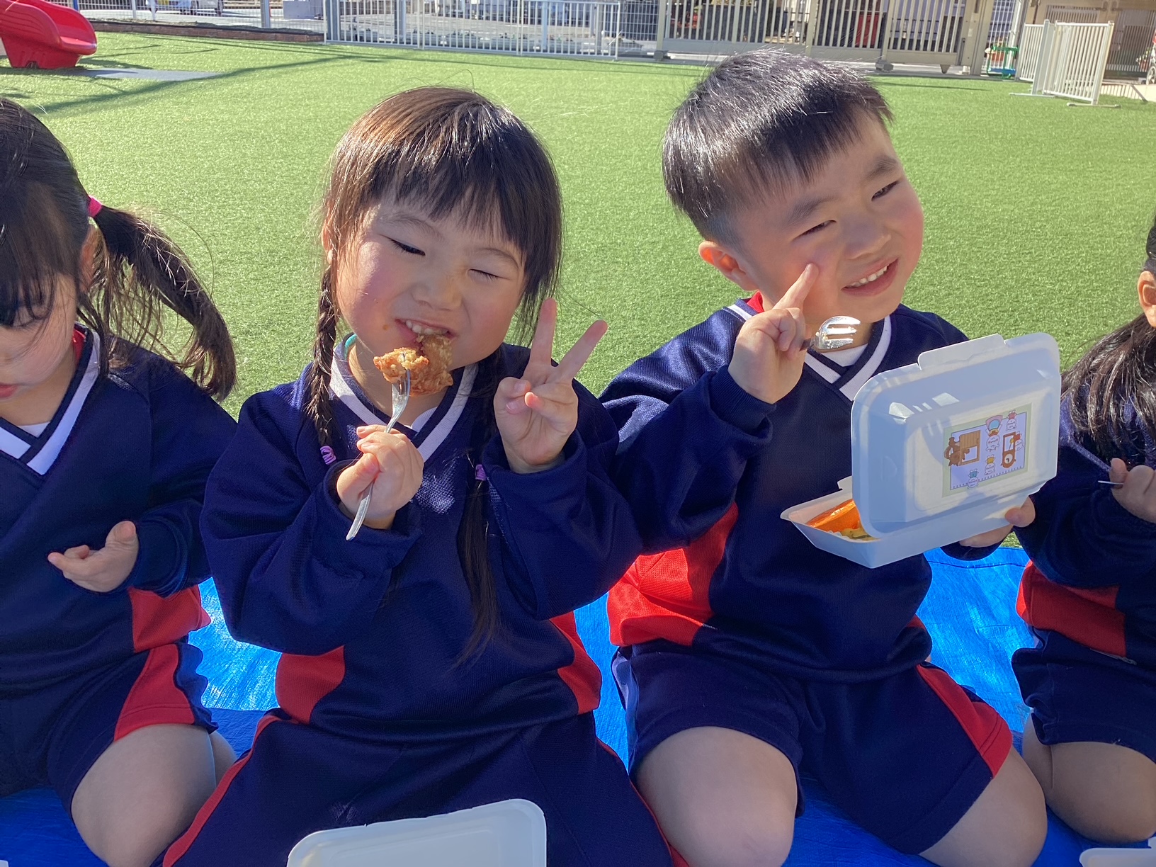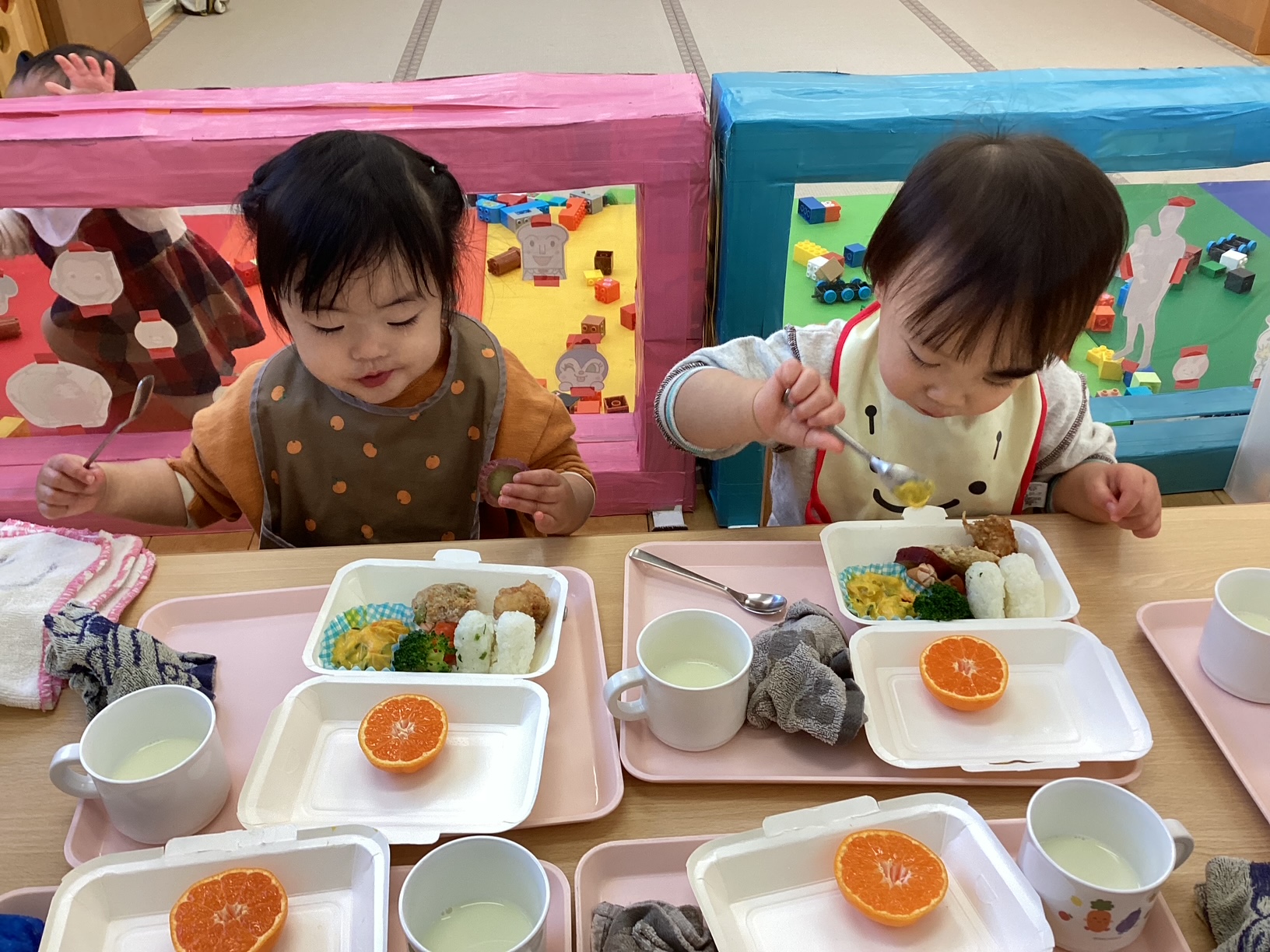 給食 ・おにぎり ・鶏肉の唐揚げ ・つくね ・かぼちゃサラダ ・さつまいもの甘煮 ・ウインナー ・ミニトマト ・ブロッコリー ・みかん 昼おやつ ・ケーキ