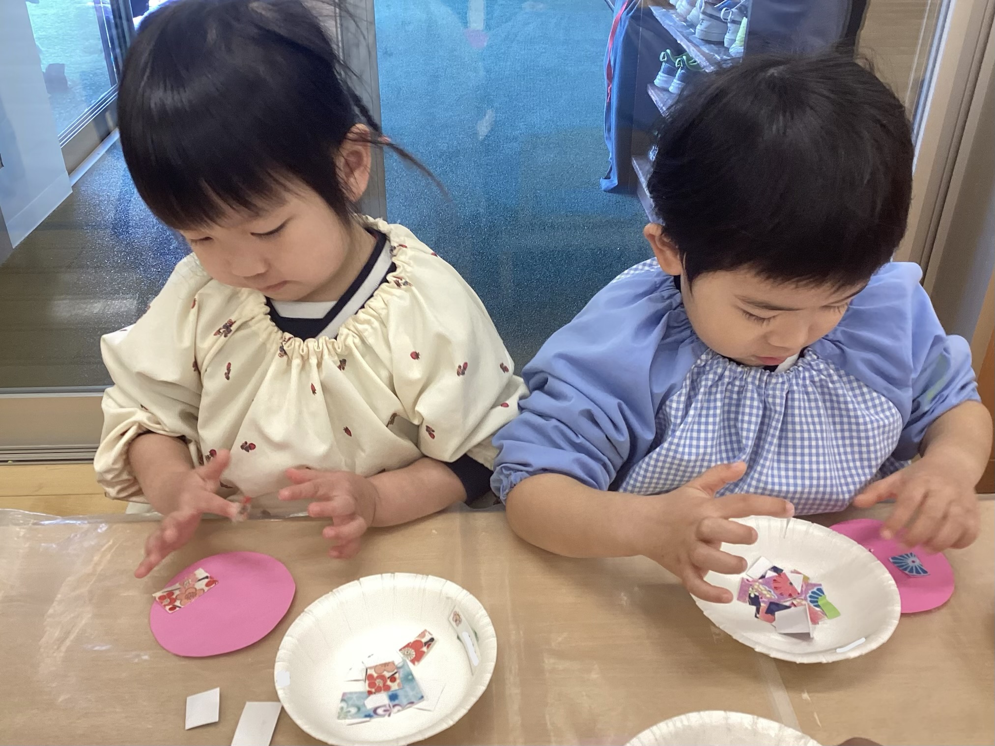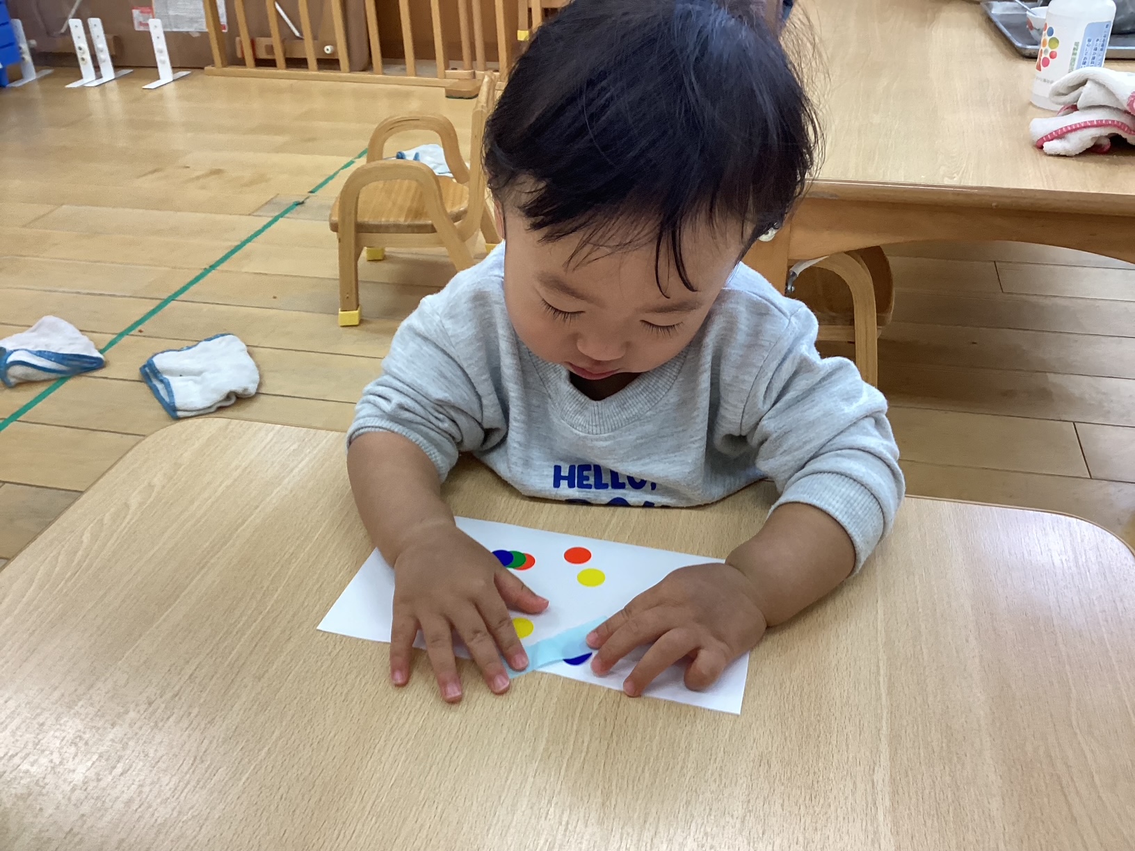 シール貼りをしました!指先を使って上手にはれました。なくなるともっとちょうだいと意欲的な子どもたちです!