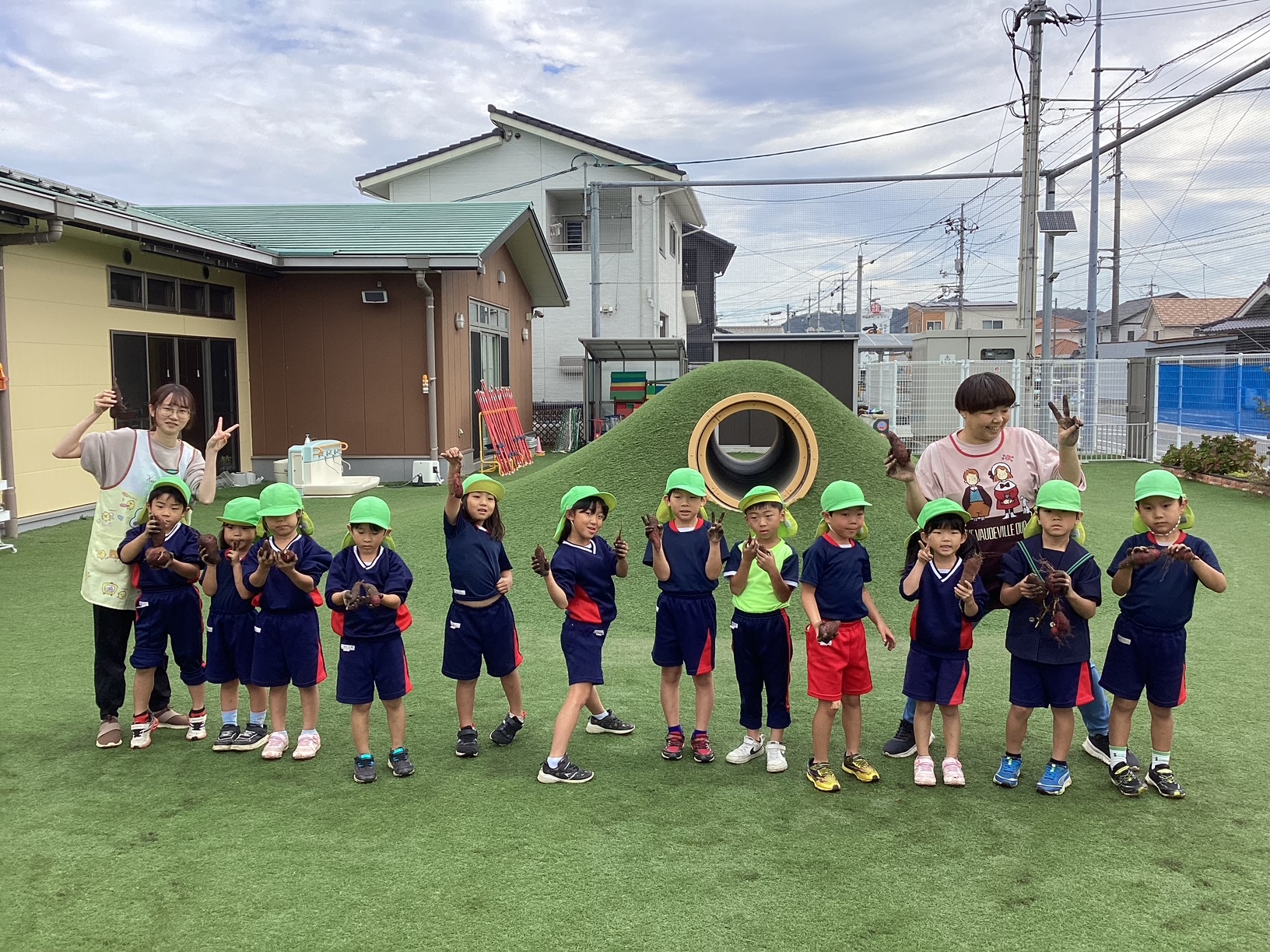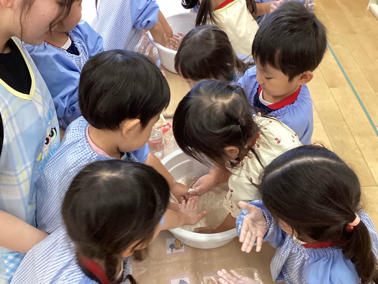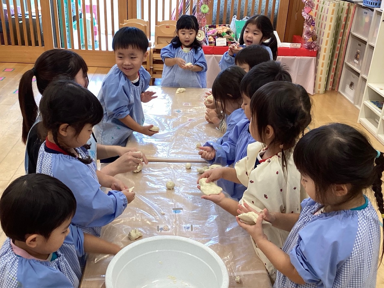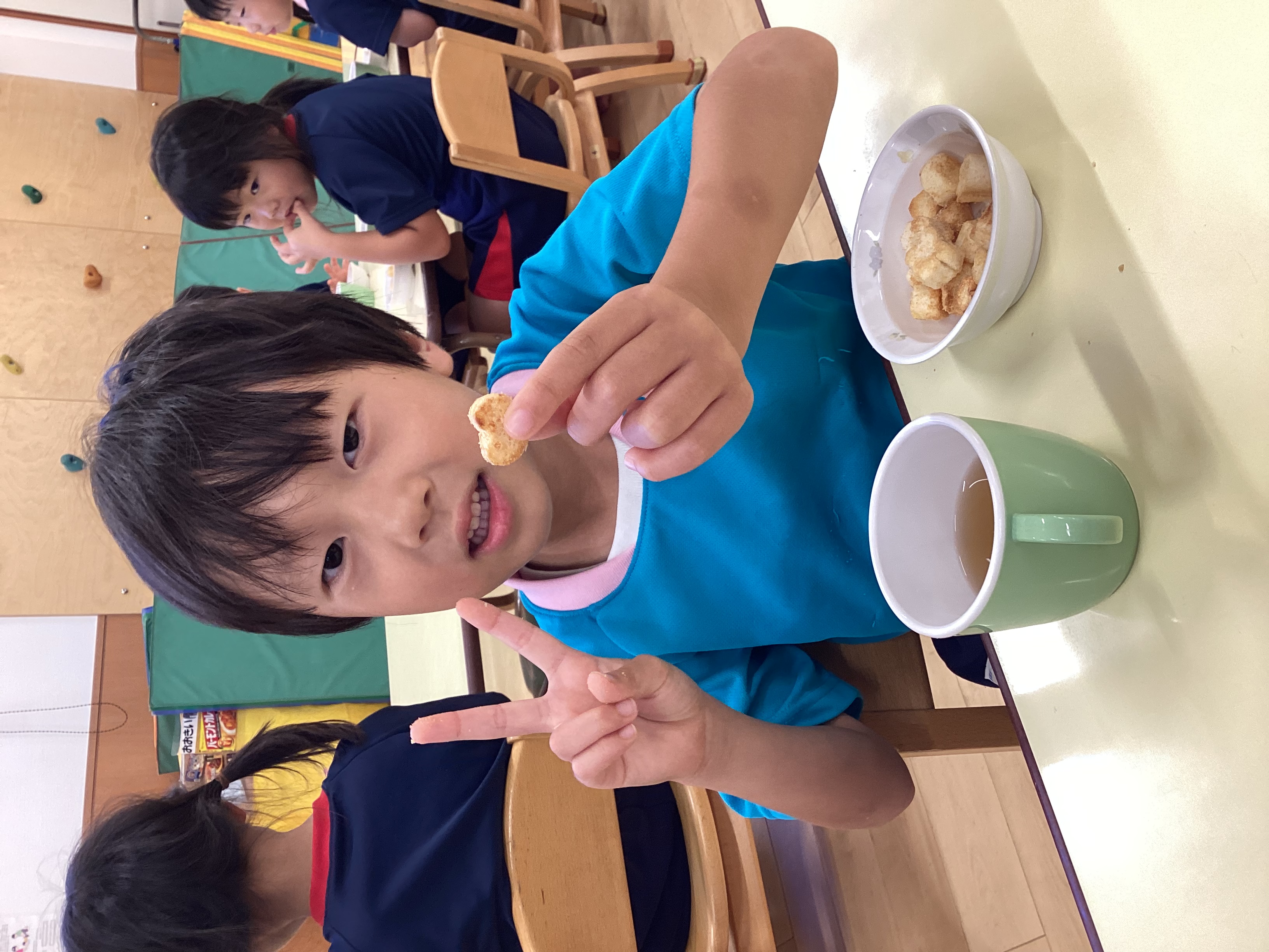 - 普段なかなか触れることのないきのこに興味津々で、楽しそうに触ったりにおってみたりしていました。秋の味覚に触れる活動は、子ども達が自然の恵みや季節の変化を感じ、食への関心を深める貴重な機会です。食育活動を通して、食材と出会い、親しむことで、食べることの楽しさやありがたさを学んでいってほしいです。