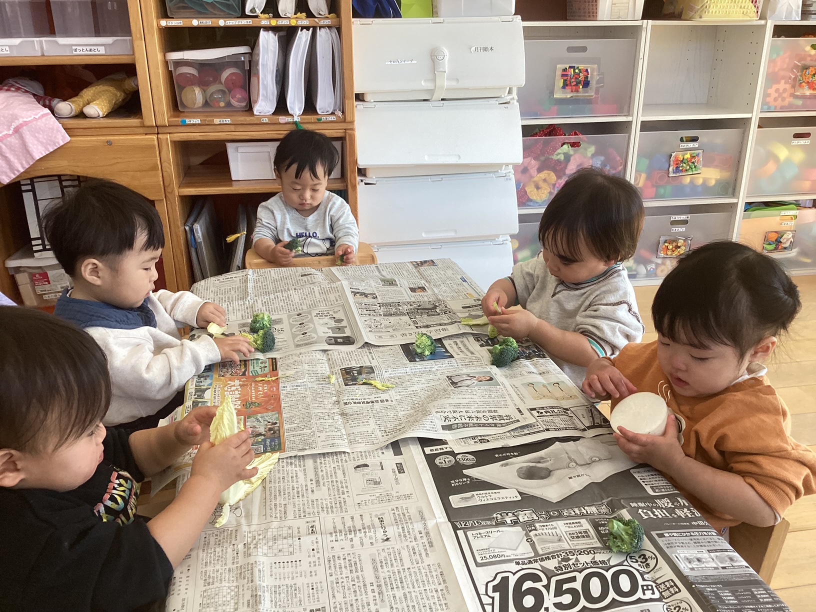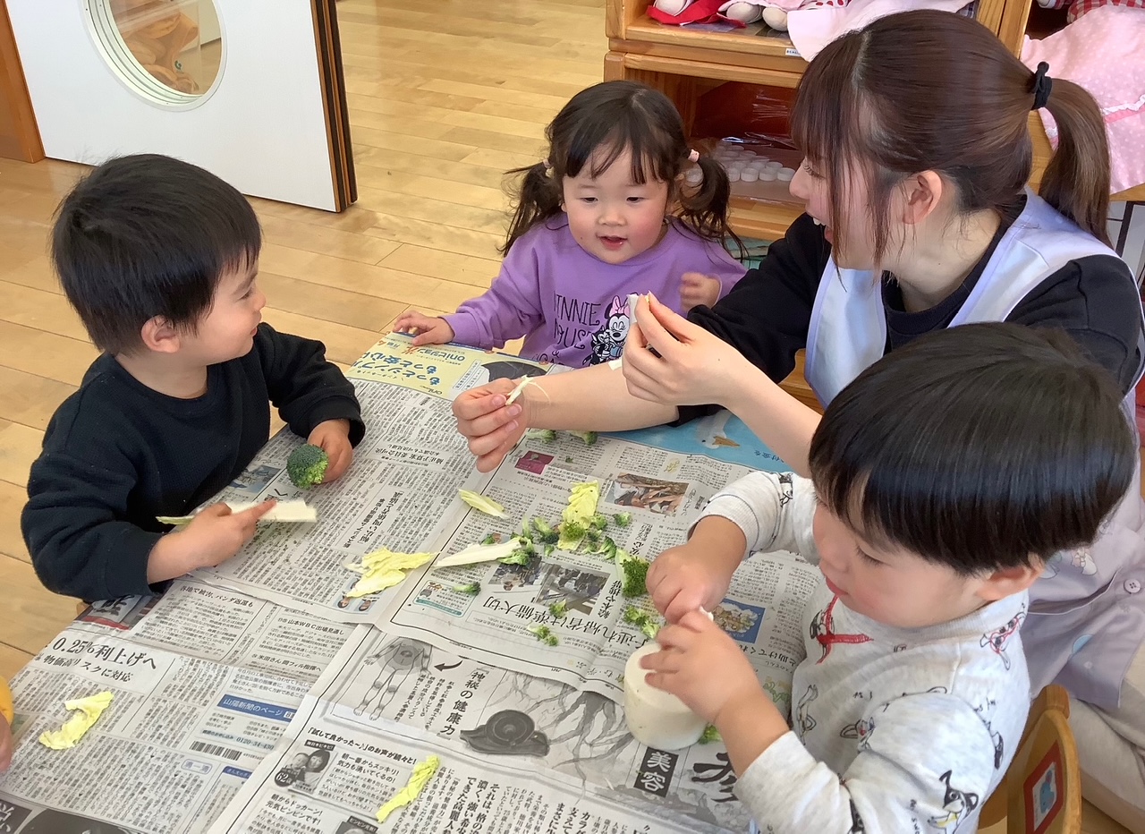 ほうれん草は根っこの部分が赤いんだよ。とお話し、ほうれん草と小松菜の違いも覚えてもらいました。またおうちでもお話を聞いてみて下さい。