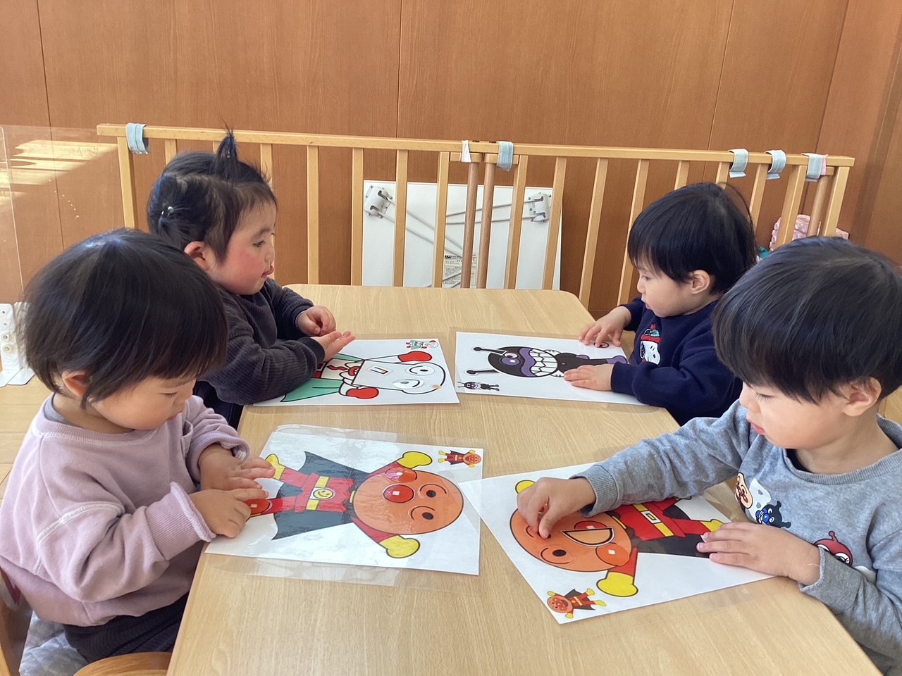 お正月遊びは「福笑い」 アンパンマンの福笑いで遊んだよ! みんな上手に目や鼻を置くことができたね✨