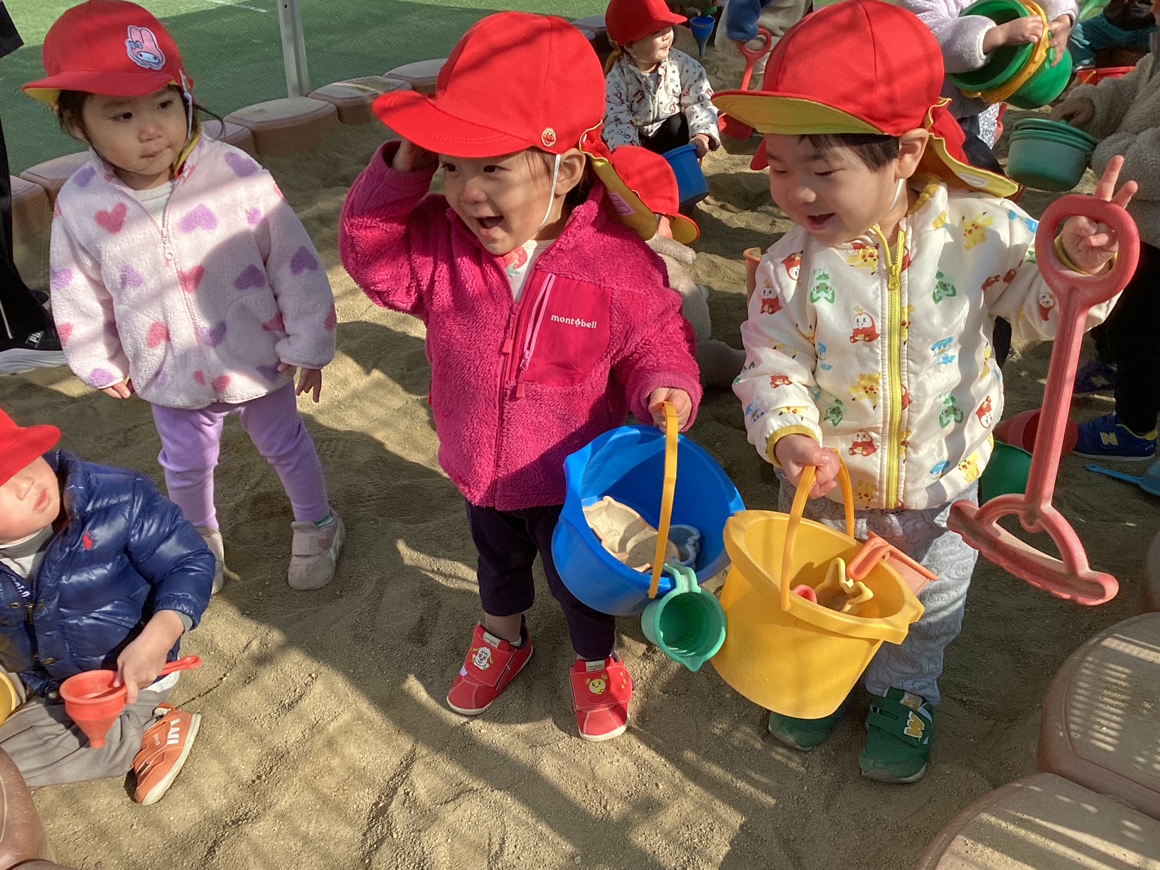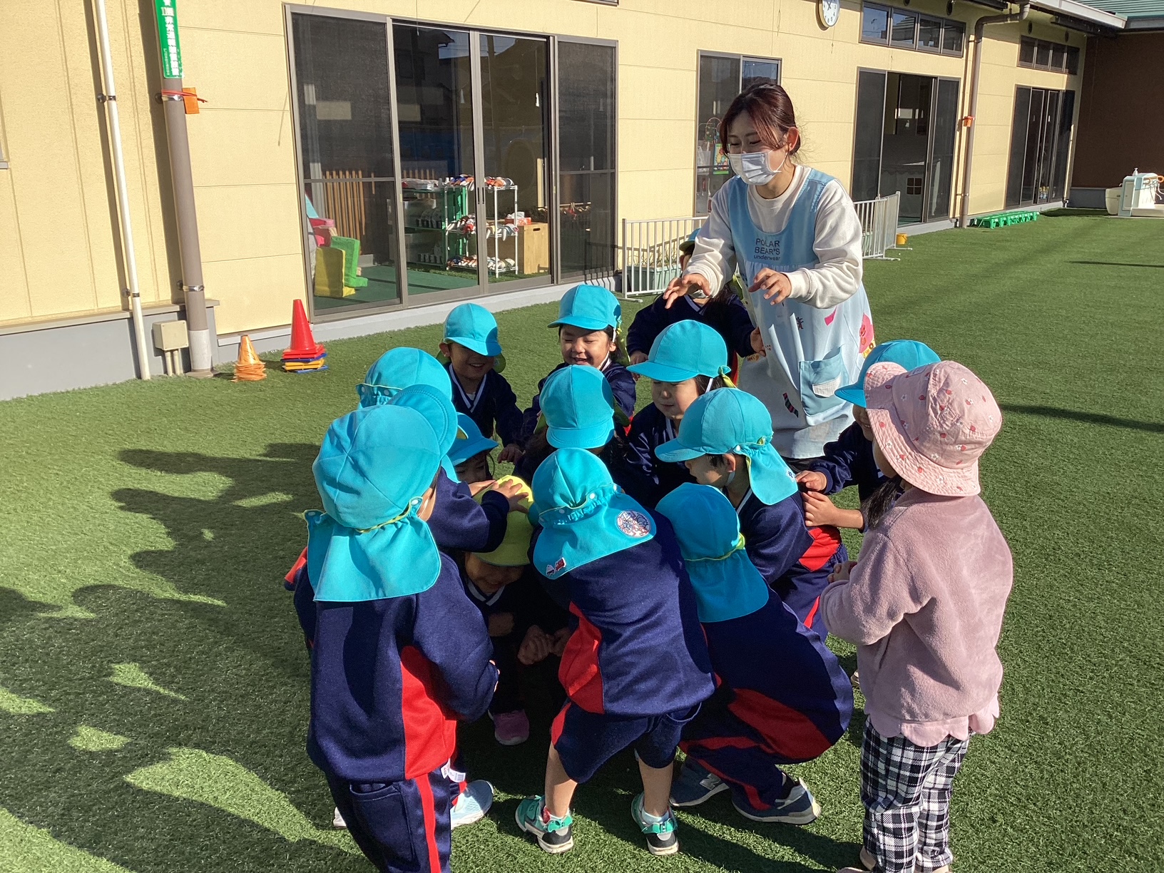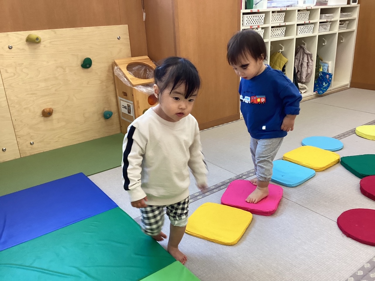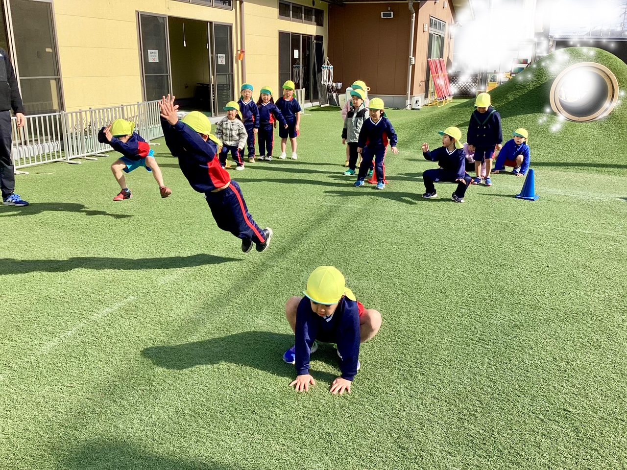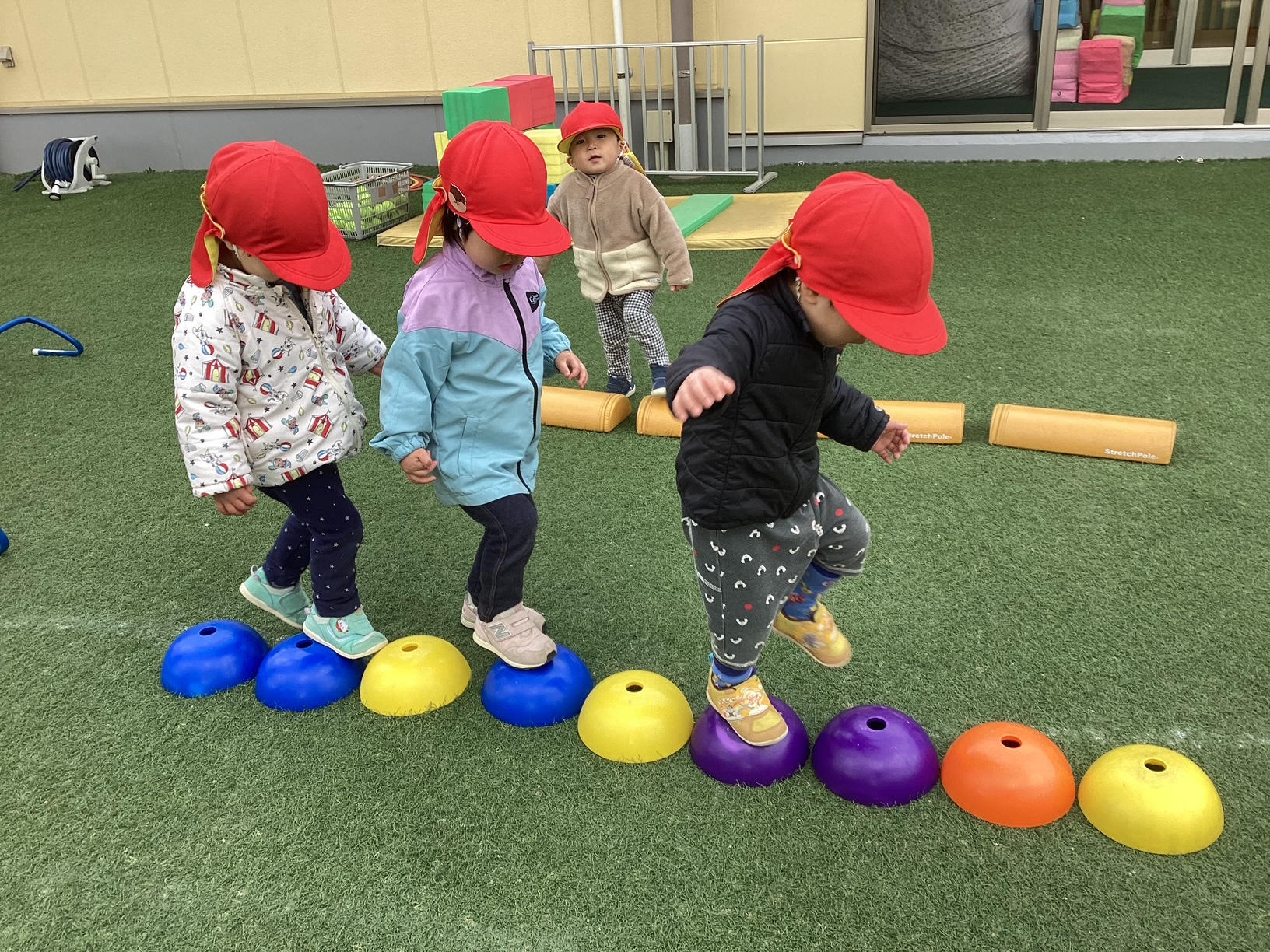 寒い日でも、運動遊あそびではしっかり体を動かしています! カエルジャンプは、こんなに高く跳べるようになりました✨