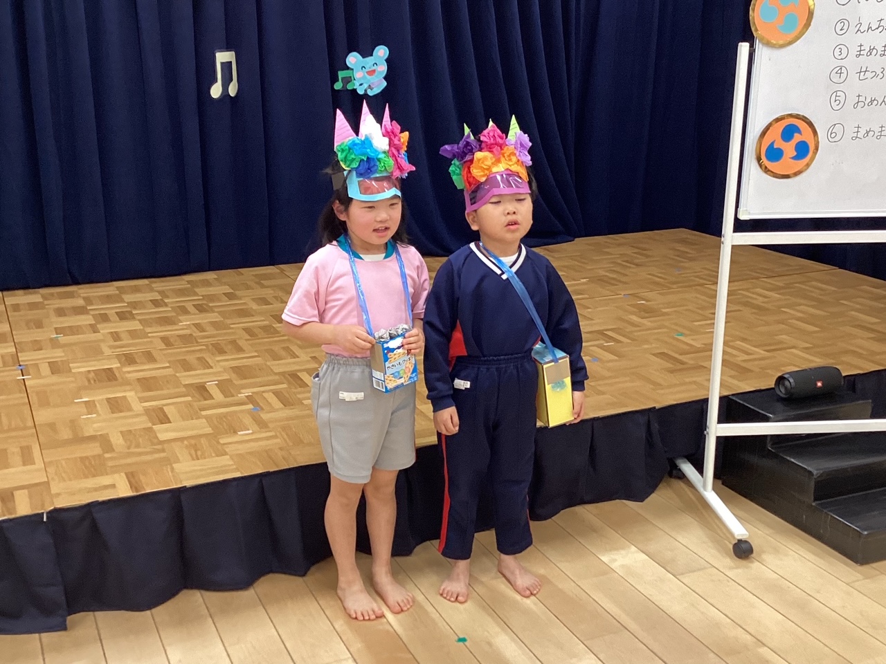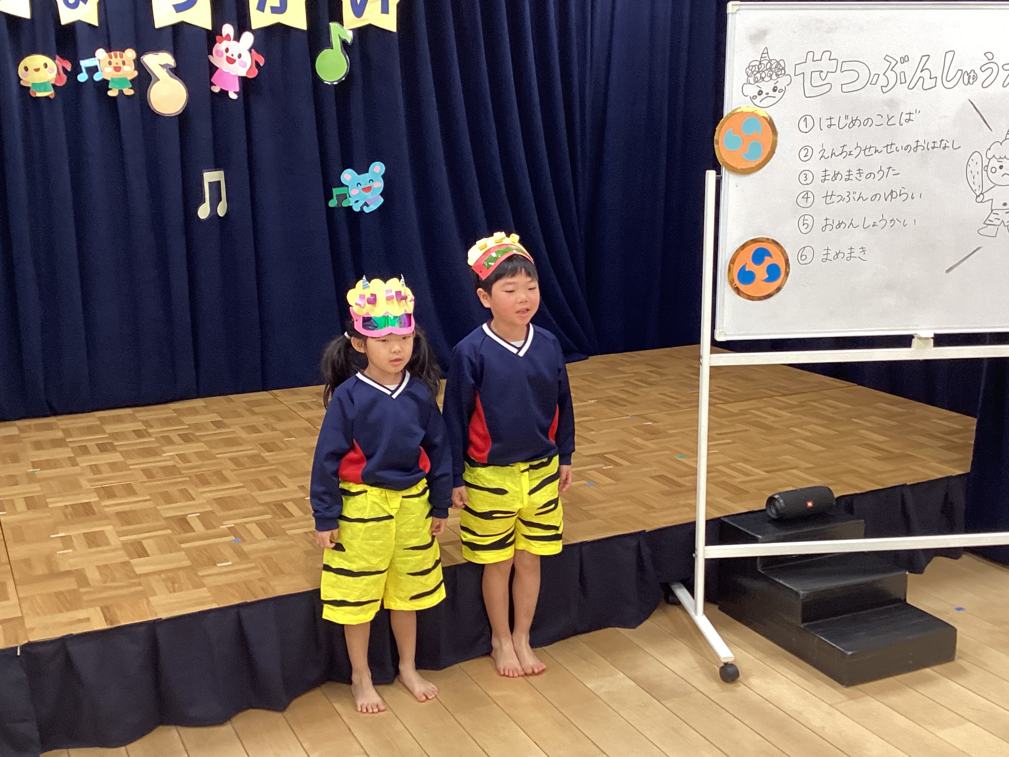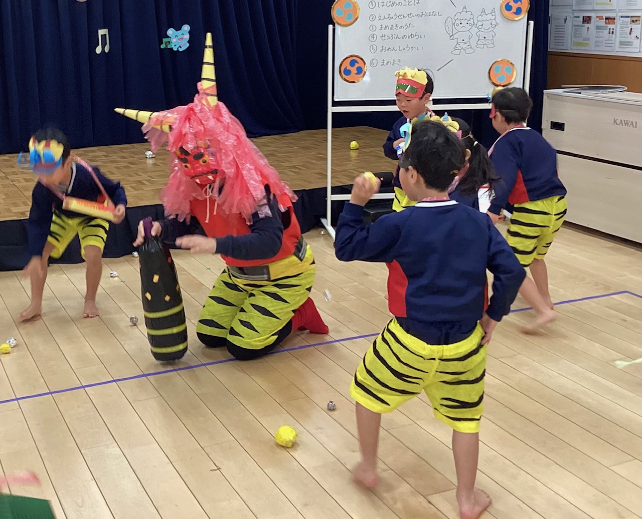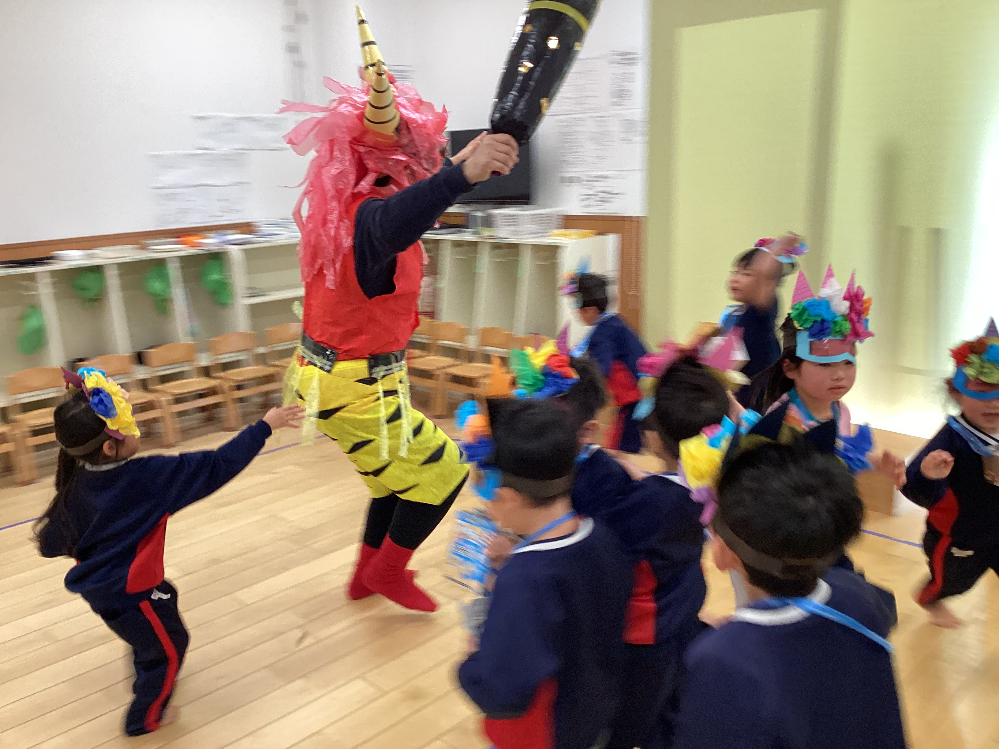 2月3日は節分の日!節分会が行われ、全クラス参加をしました! 豆まきの由来を先生に教えてもらいました♪