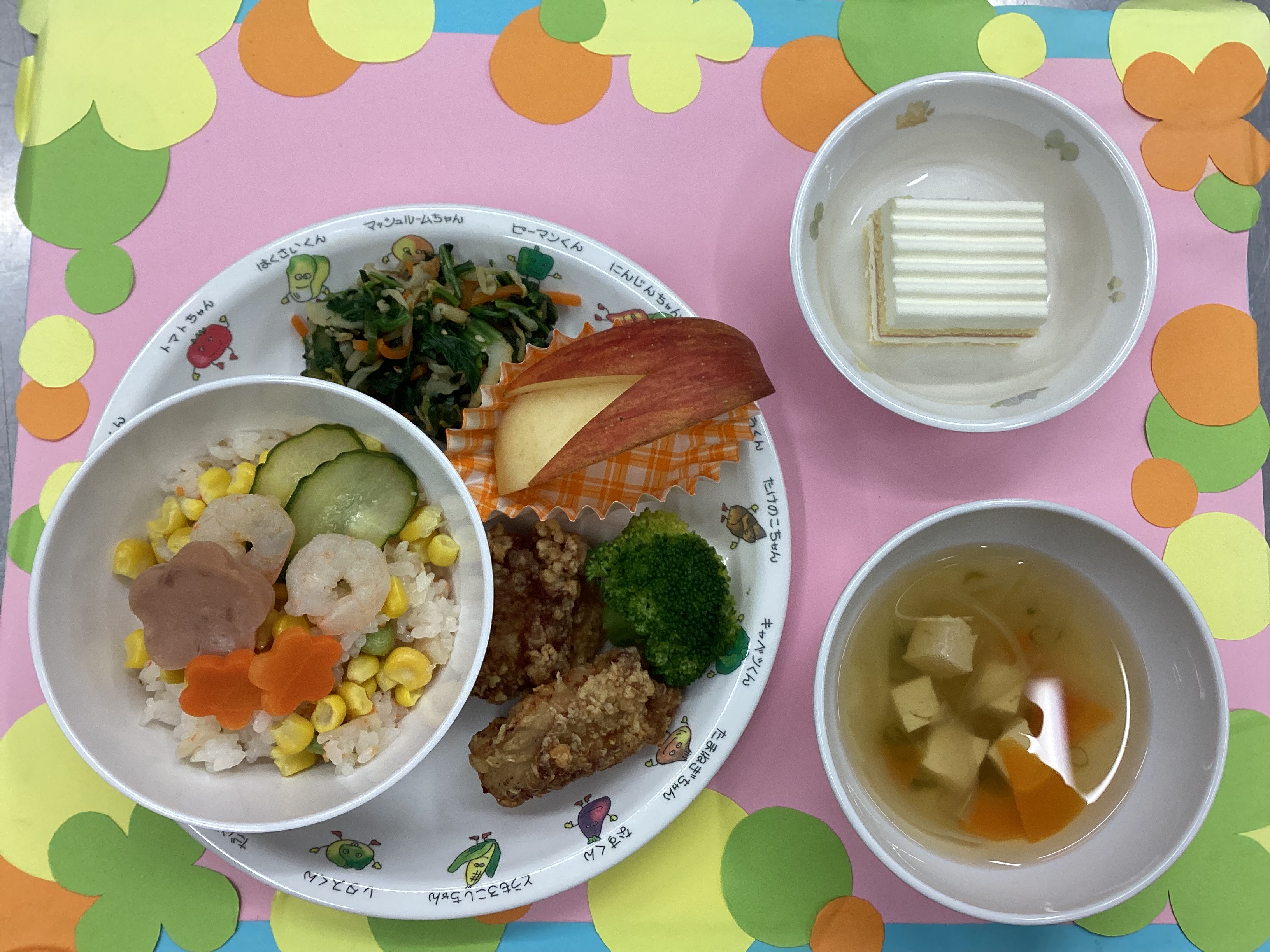 11月誕生日会メニュー ⚫︎飾り寿司 ⚫︎鶏の唐揚げ ⚫︎ほうれん草のごまあえ ⚫︎すまし汁 ⚫︎りんご 昼おやつ ⚫︎ジュース ⚫︎ケーキ
