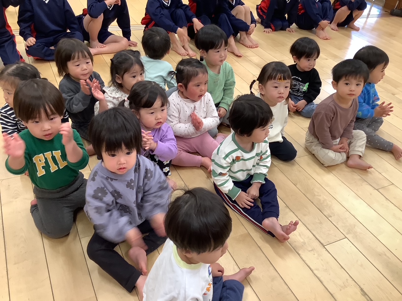 発表会の練習をみて、「がんばれー!」と応援しているちゅうりっぷ組! 手を叩いてリズムに乗ったり、「すごいね〜」と話したりして練習を見ました! 僕たち私たちも練習頑張るぞー!