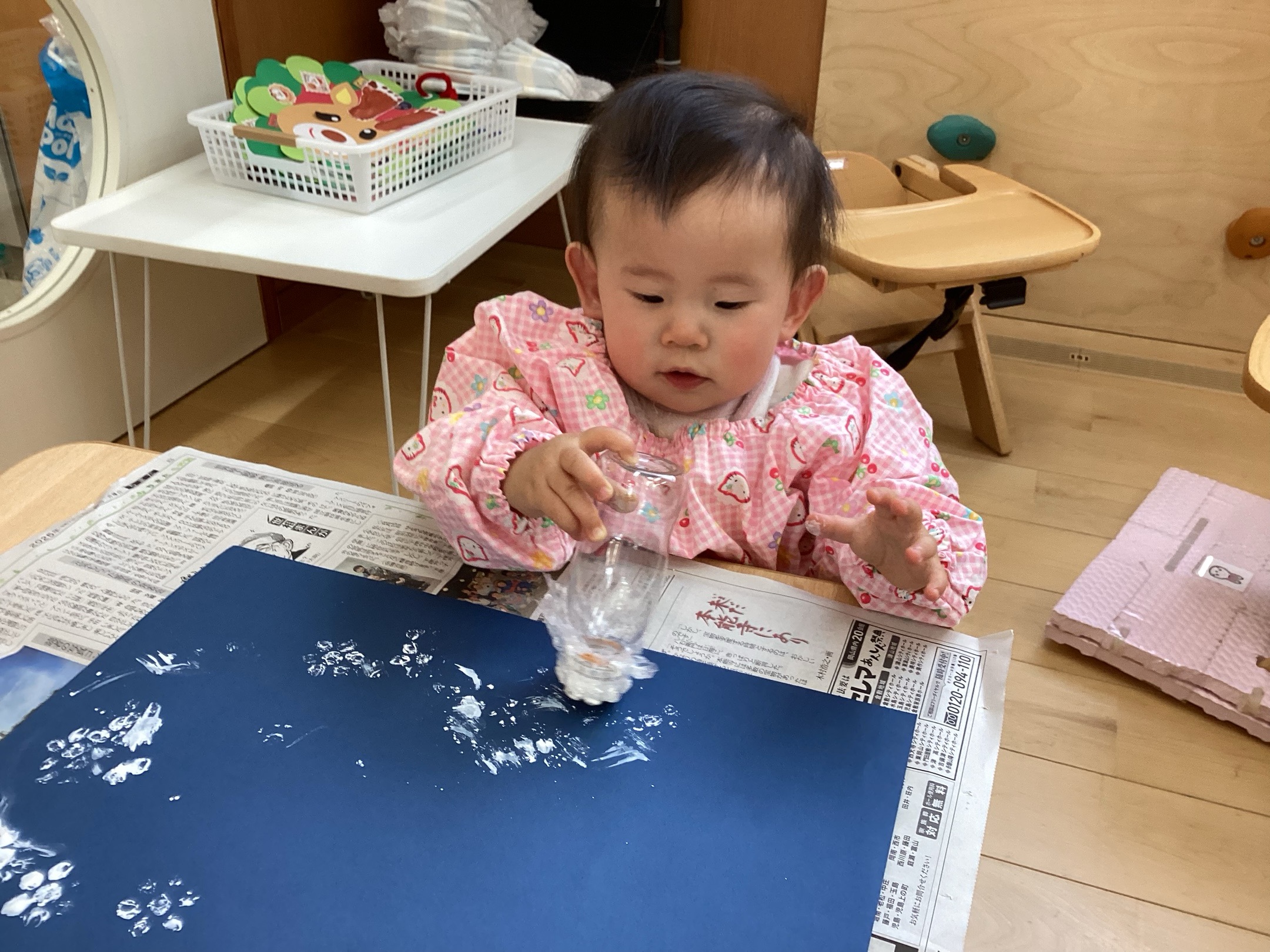 雪の結晶に見立てたタンポ❄️ポンポン楽しいな!