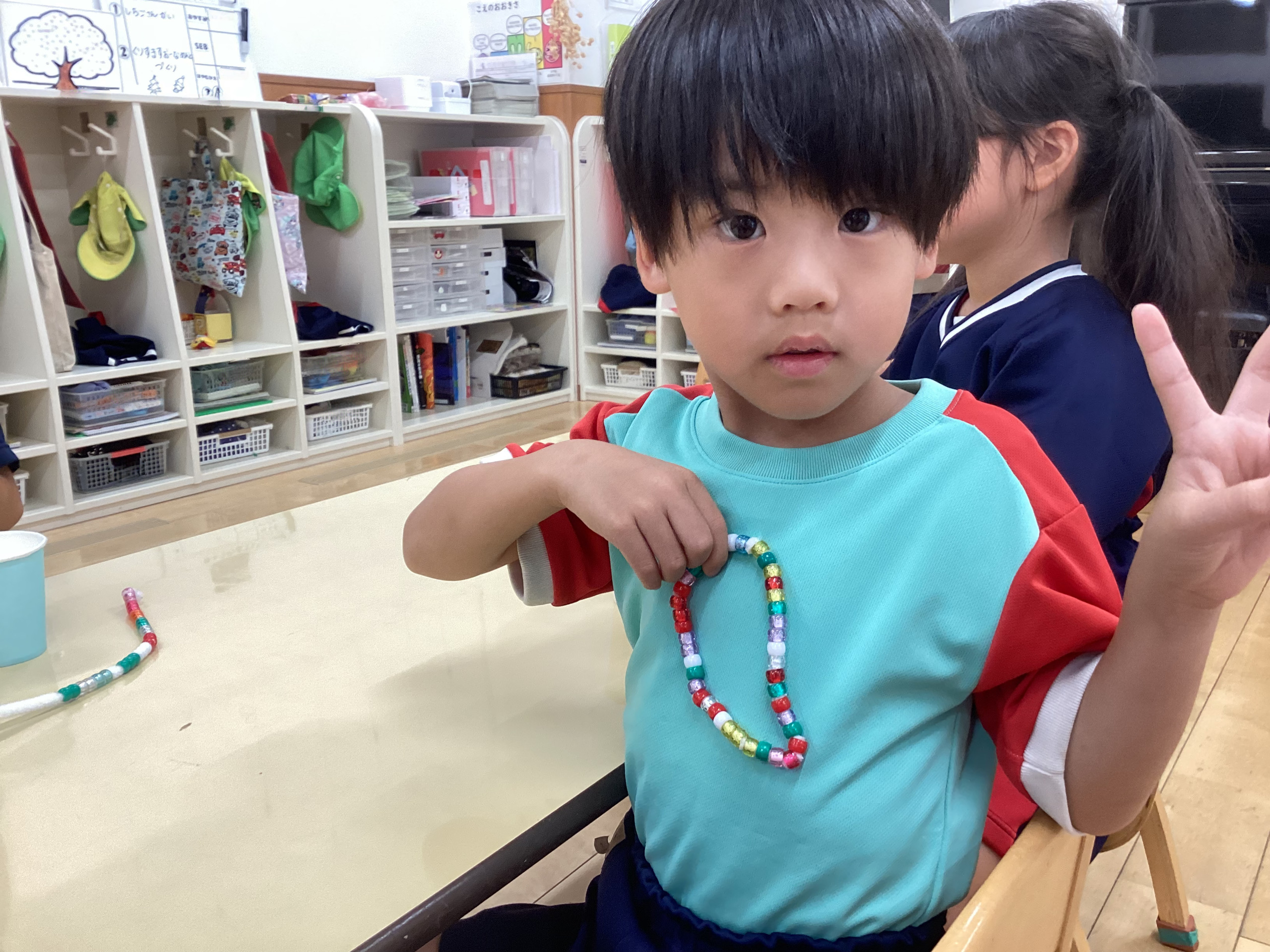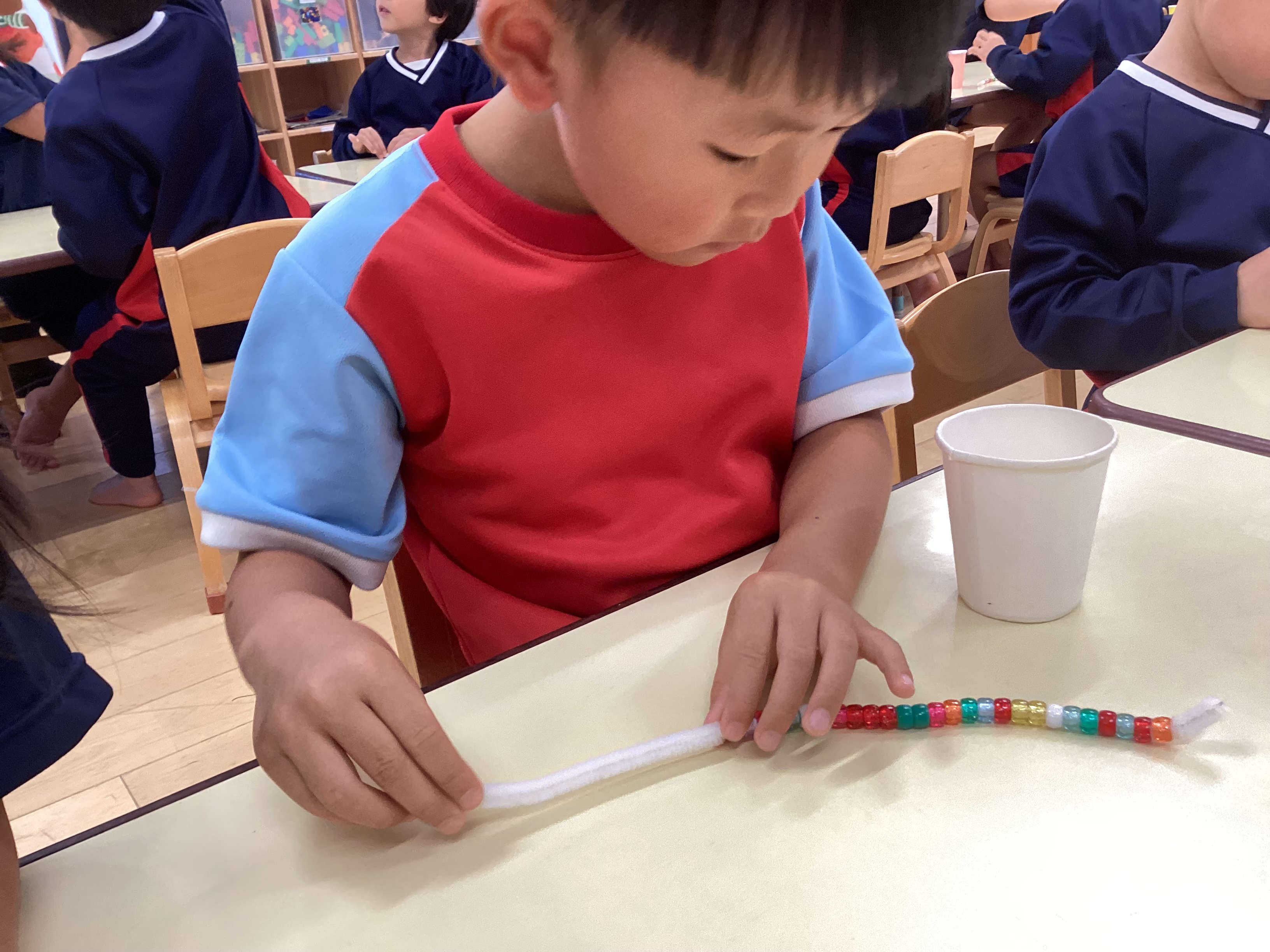 ビーズを全部通した後はみんな好きな形にしました! これはおばけの形です♪