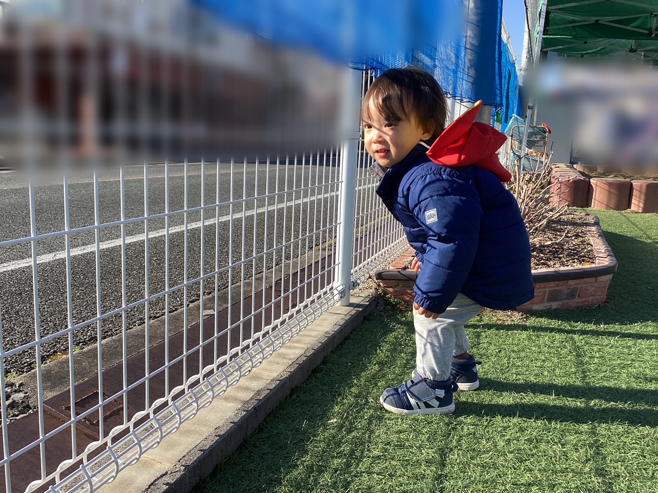 園庭から見るトラックやバスが大好き!来ないかなぁと探しています♪