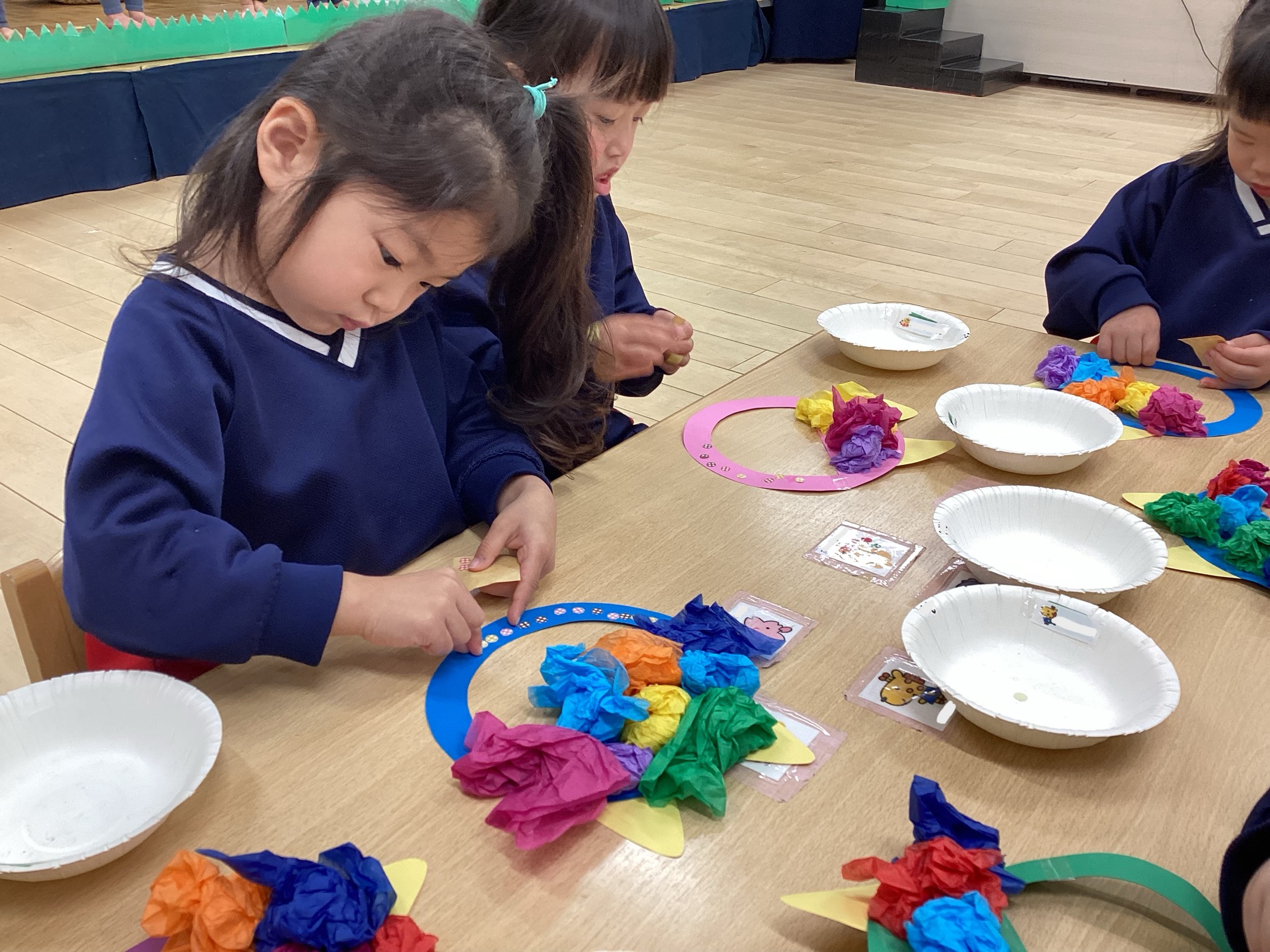 小さいちゅうりっぷ組のお面は、花紙を自分で丸めて作りました✨