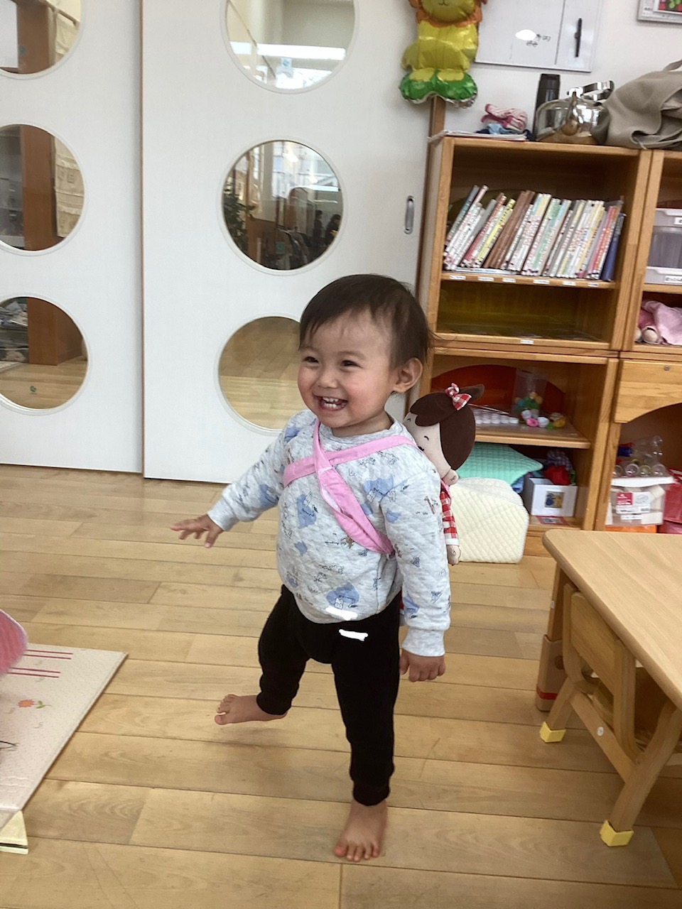 僕はお兄ちゃん!赤ちゃん(人形)のお世話もできるよ!赤ちゃん背負っていい笑顔☺️