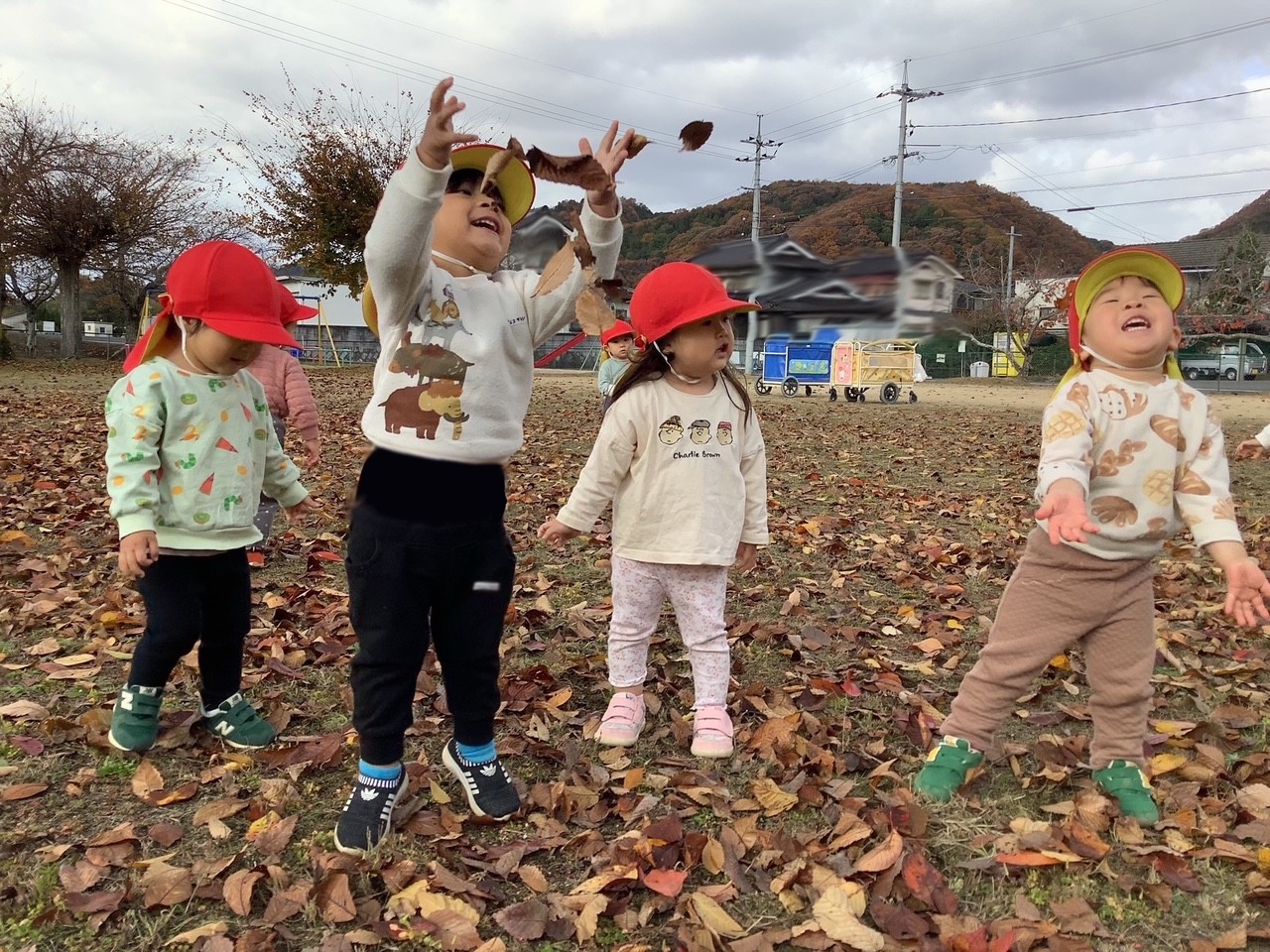 定信公園へ行ったらたくさん葉っぱがあったね! みんなで「せーのっ」の声掛けで葉っぱをパラパラ〜✨