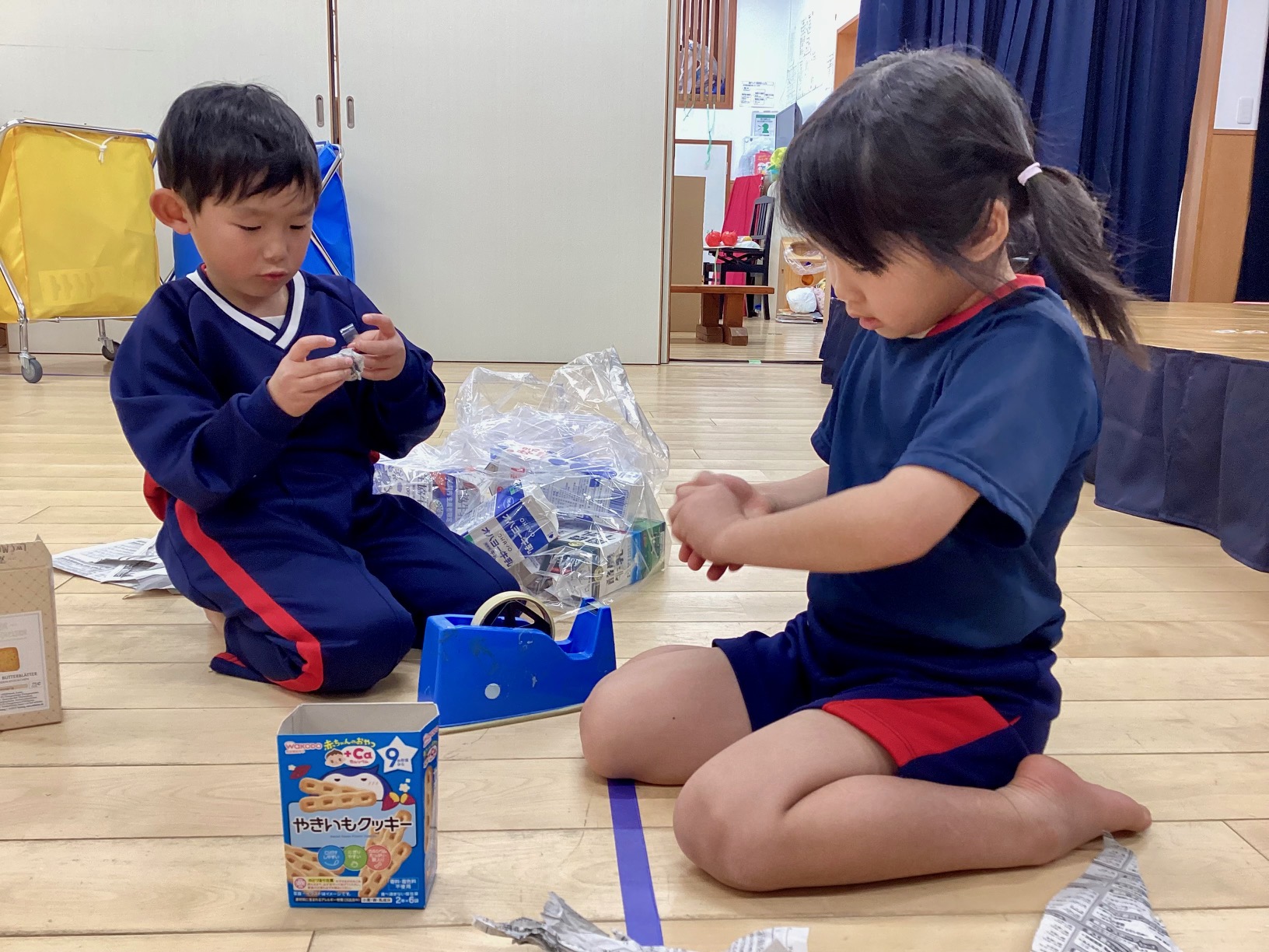 くしゃくしゃ丸めて袋に詰めました!上手に握れるようになり、たくさん丸めていましたよ!何ができあがるかな
