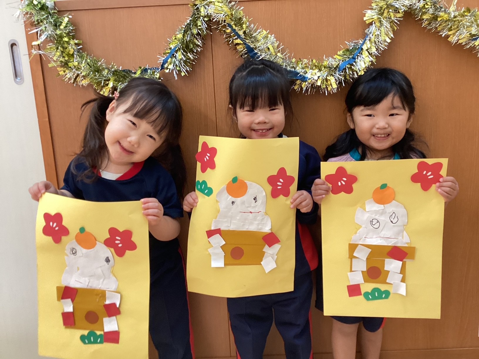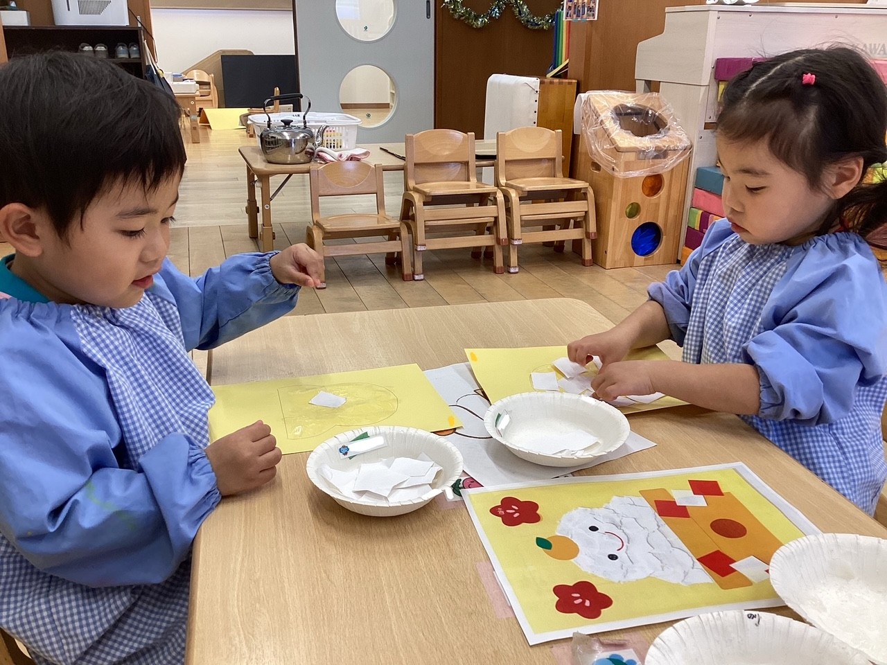1月の壁面の製作をしました!紙をちぎってのりで貼ったよ!
