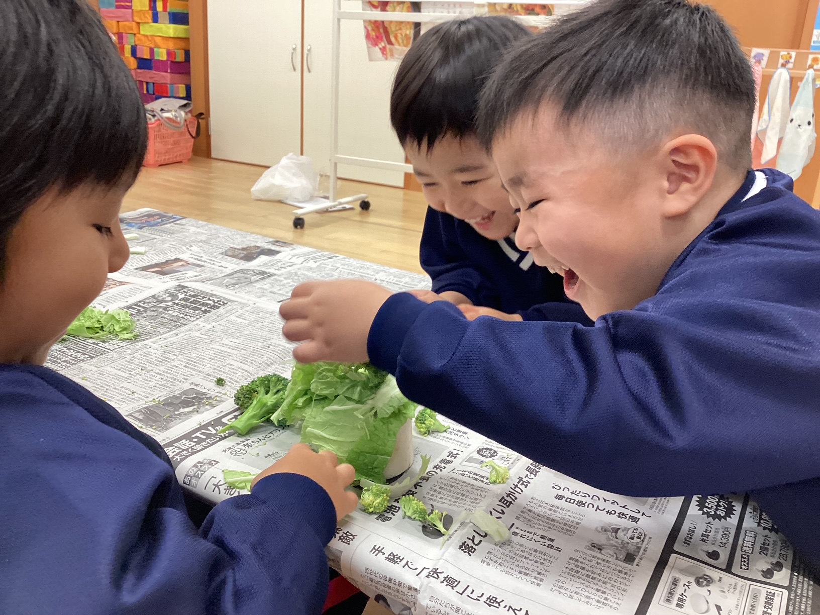 白菜をビリビリしてみたよ! 「わぁ!」と興味を持ちながら触れて楽しむことができたね