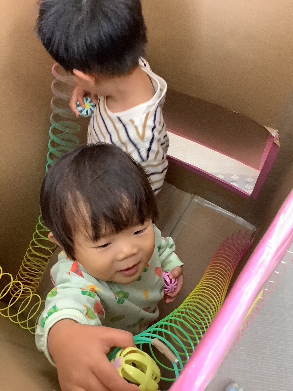 運動会で使った大きいたべっこ動物の箱に入り、ボールをコロコロ転がして遊んだよ✨