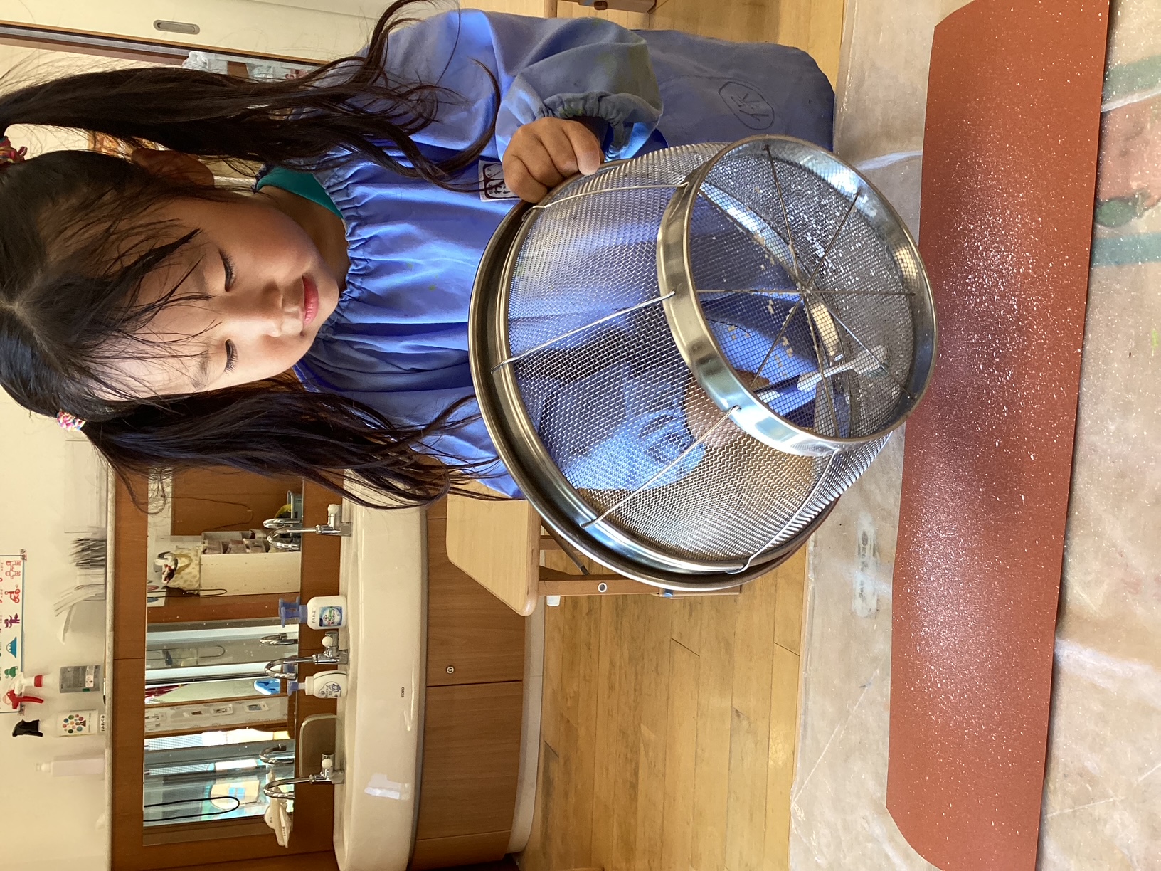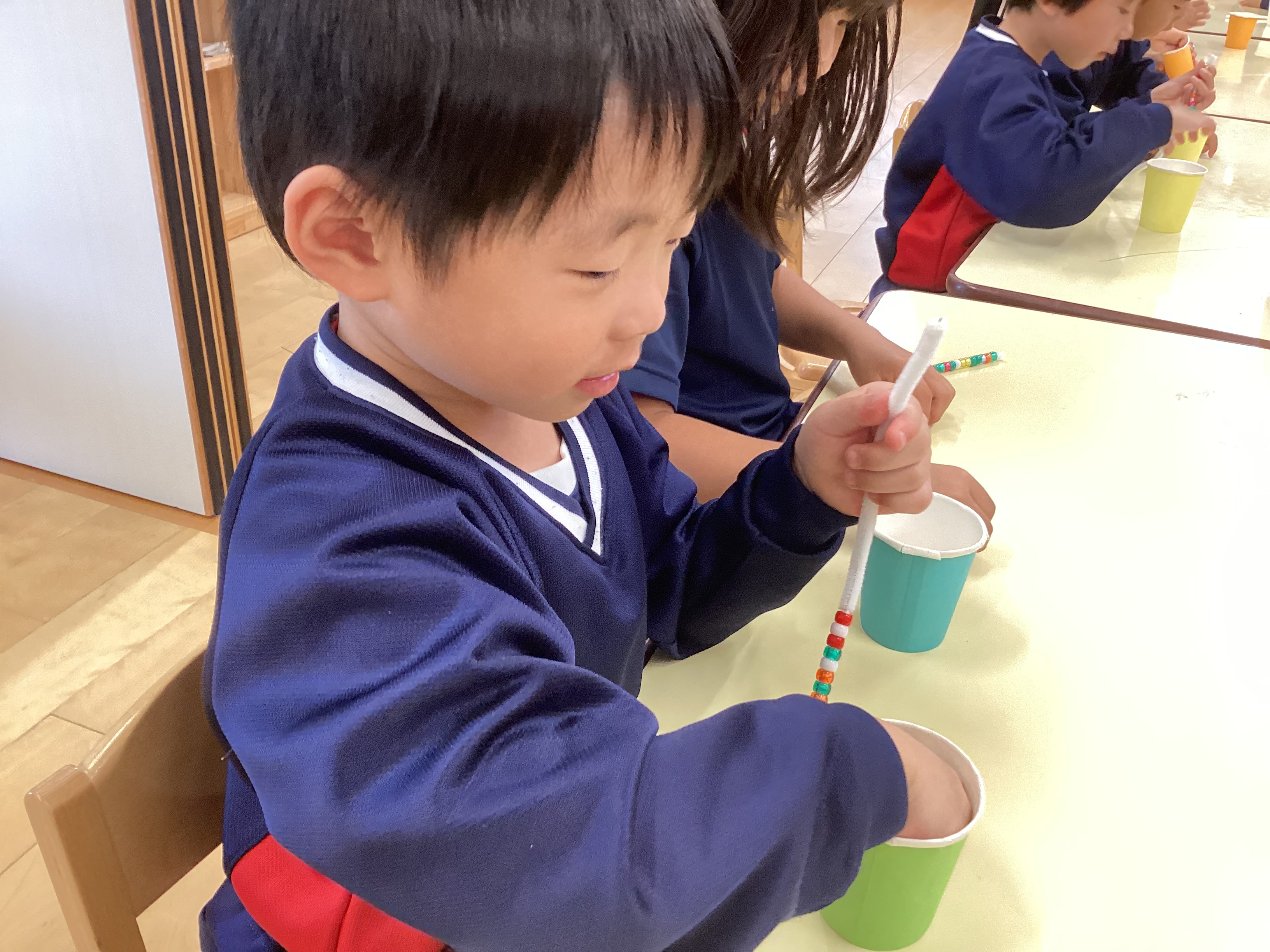 クリスマスハット製作では、歯ブラシとザルを使ってシャカシャカ…ケーキを作りました。
