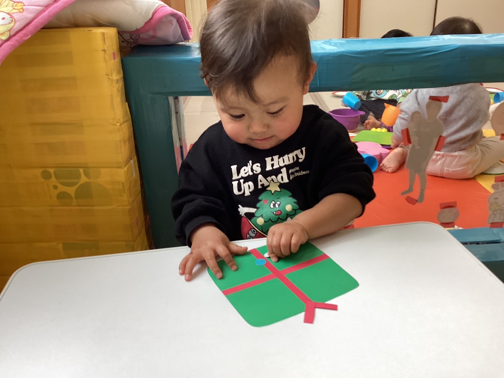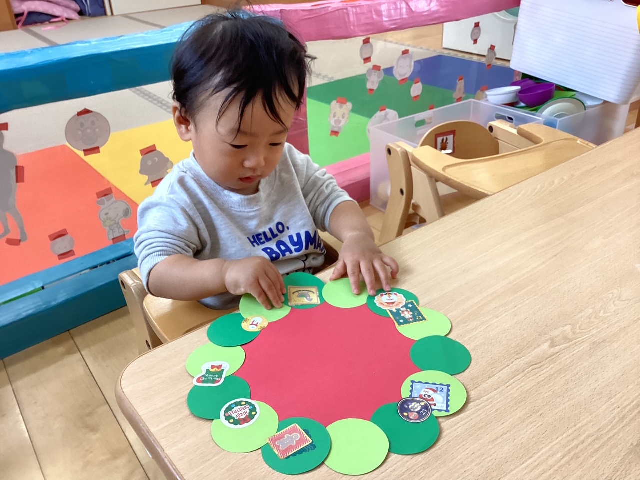 クリスマスリースを作りました!たくさんペタペタ貼れて喜んでいました!