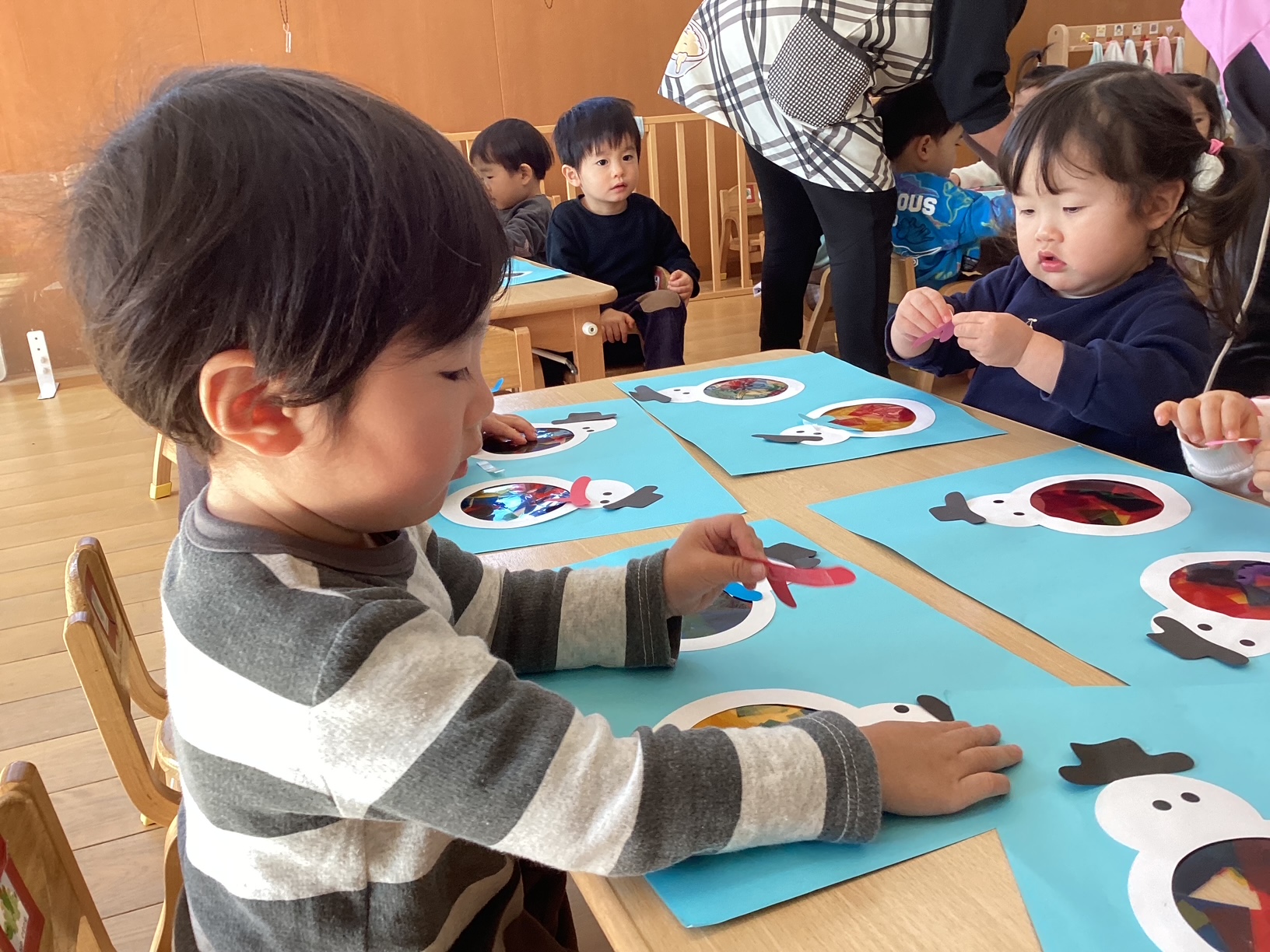 2月の製作、雪だるまを作ったよ❄️ 丁寧に顔を貼っていきます。お腹はスケルトンでかわいいです
