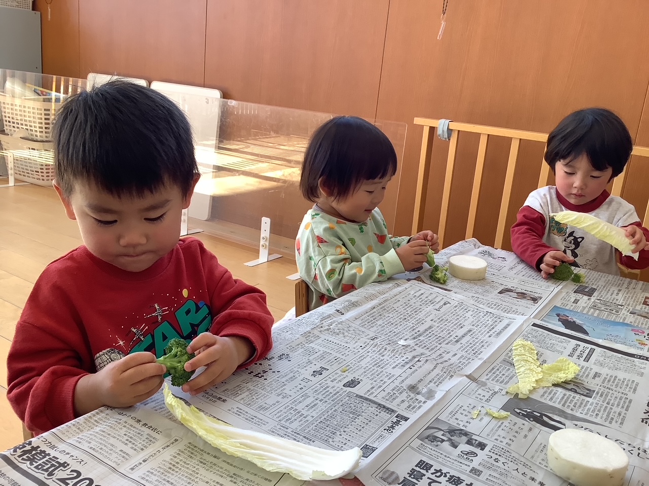 食育では冬野菜について話しを聞きました!実際に触ったり、匂ったりして感触 を味わいました