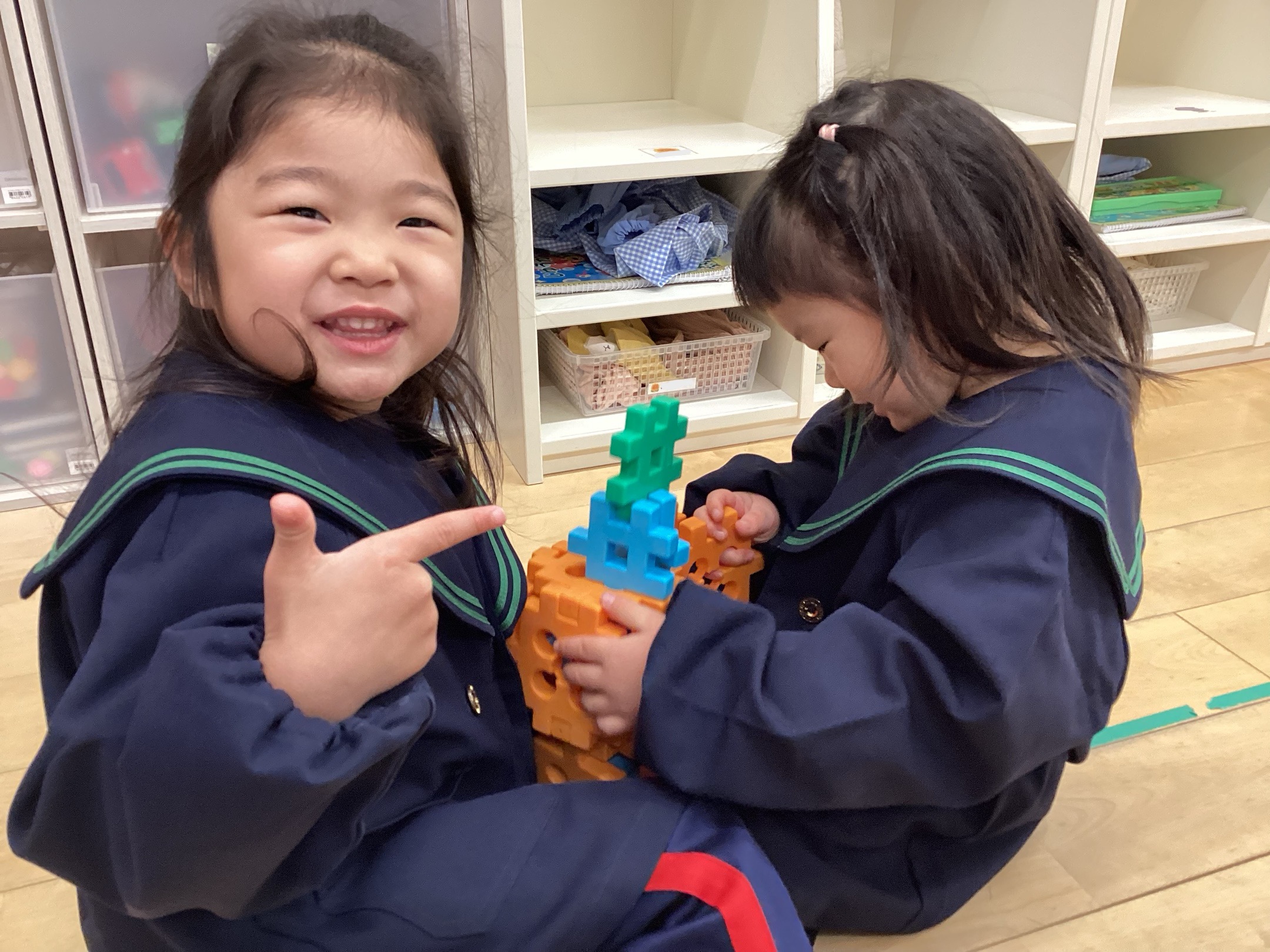 二人でブロックを雪だるまに見立てて組み立てていました!