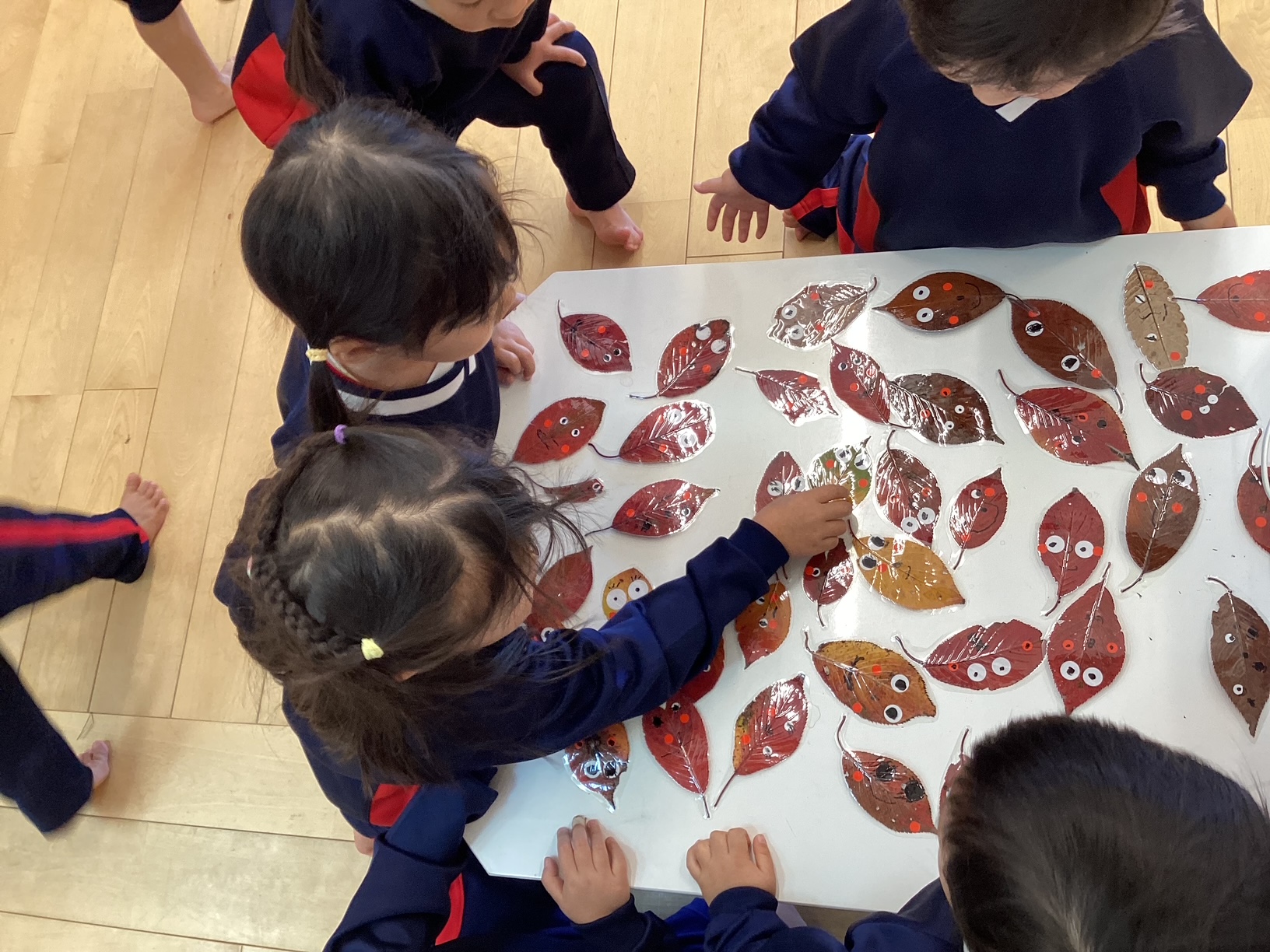 定信公園で拾った落ち葉を使って製作をしました。それぞれ違うお顔でとっても可愛いです♡