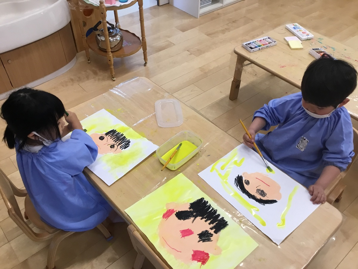 クレパスで顔を描いて、まわりを絵の具で塗りました。初めて絵の具と筆を使ってドキドキしたよ!