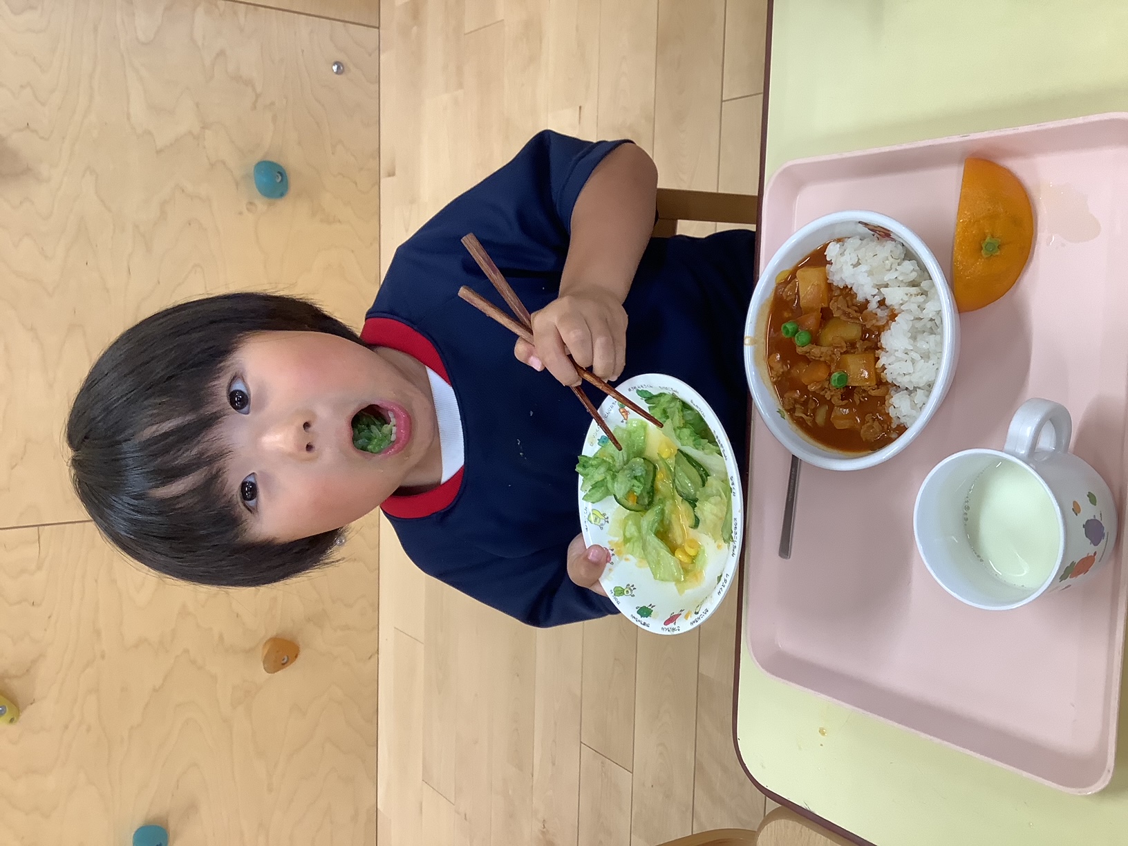 〜クッキング①〜はじめてのクッキングでは、レタスを自分でちぎって…