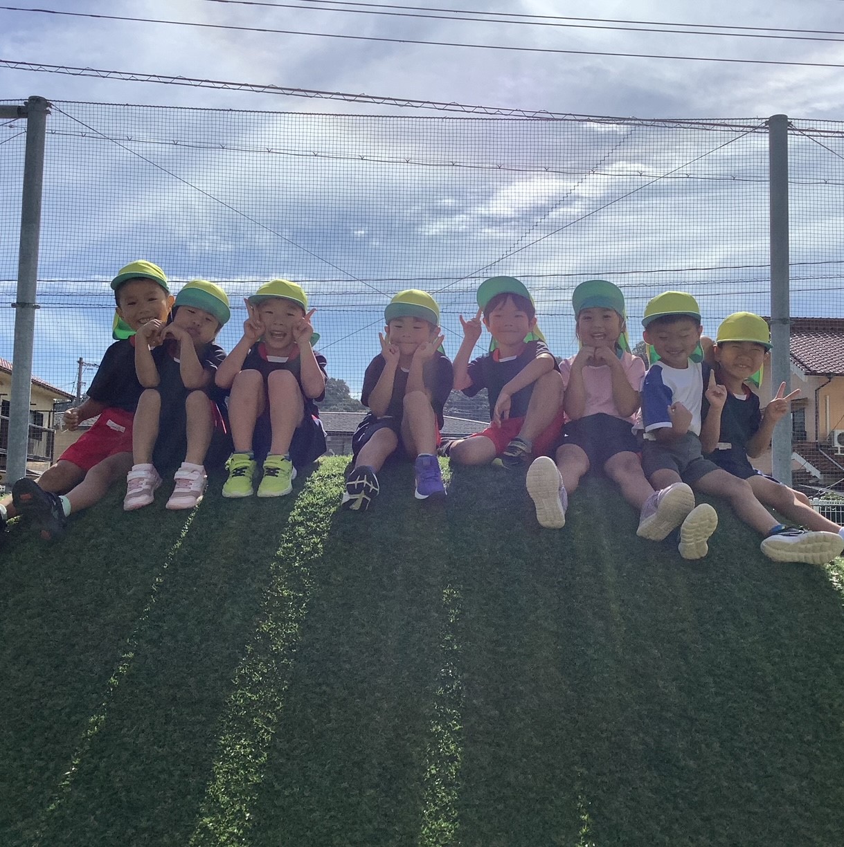 たんぽぽ組になって築山に自分たちで登れるようになったよ!! みんなで「はいチーズ✌️」