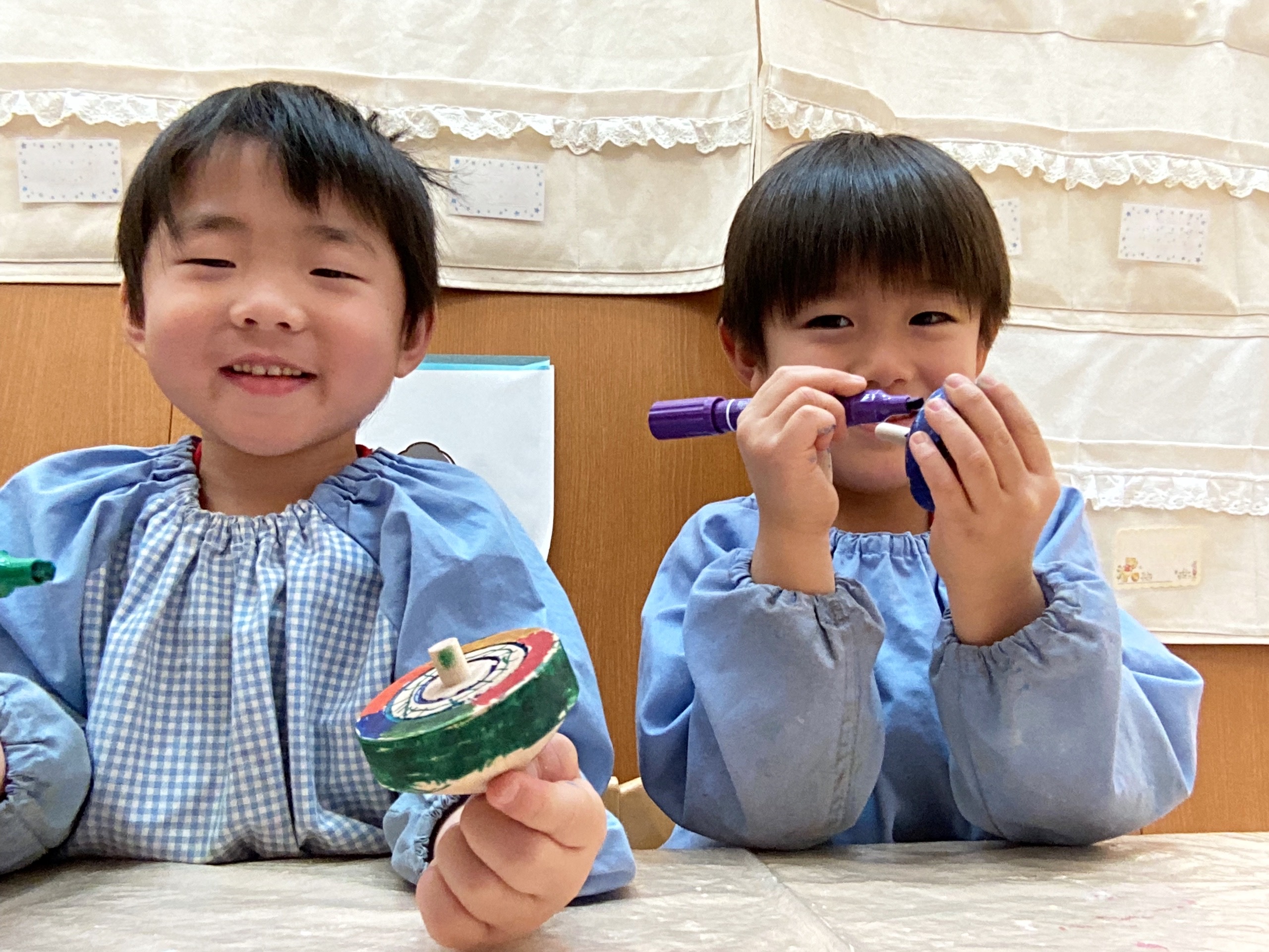 お正月遊びを楽しんでいるたんぽぽ組さんです⭐️ 独楽に色塗りをしました!