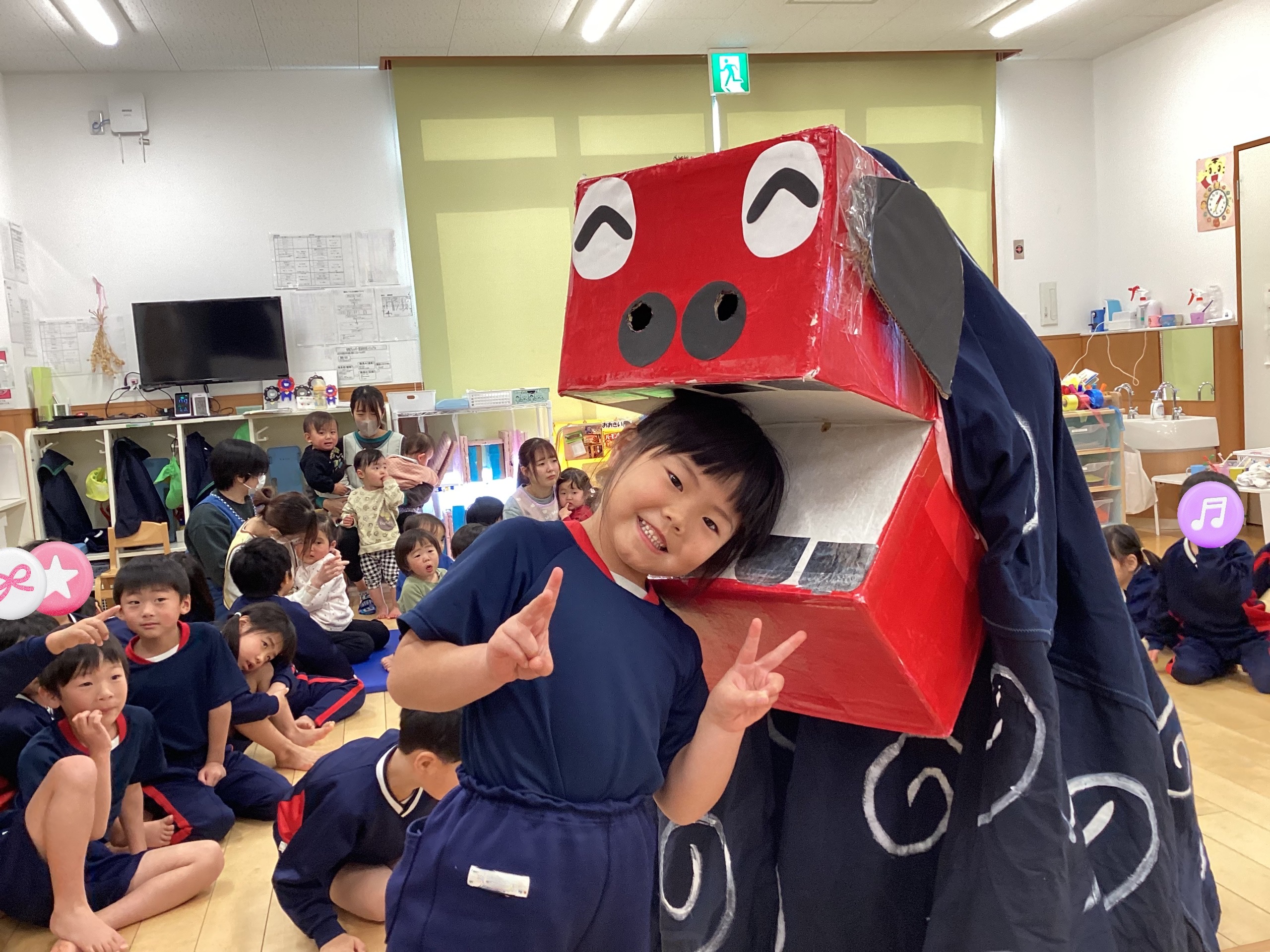 運動会ごっこでは、親子競技を楽しみました。 皆で仲良く電車に乗って走りました!