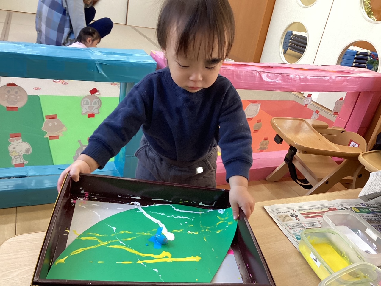 感触遊び、絵の具の色が混ざるのをみて楽しんだね! ひんやりして気持ちいいね✨