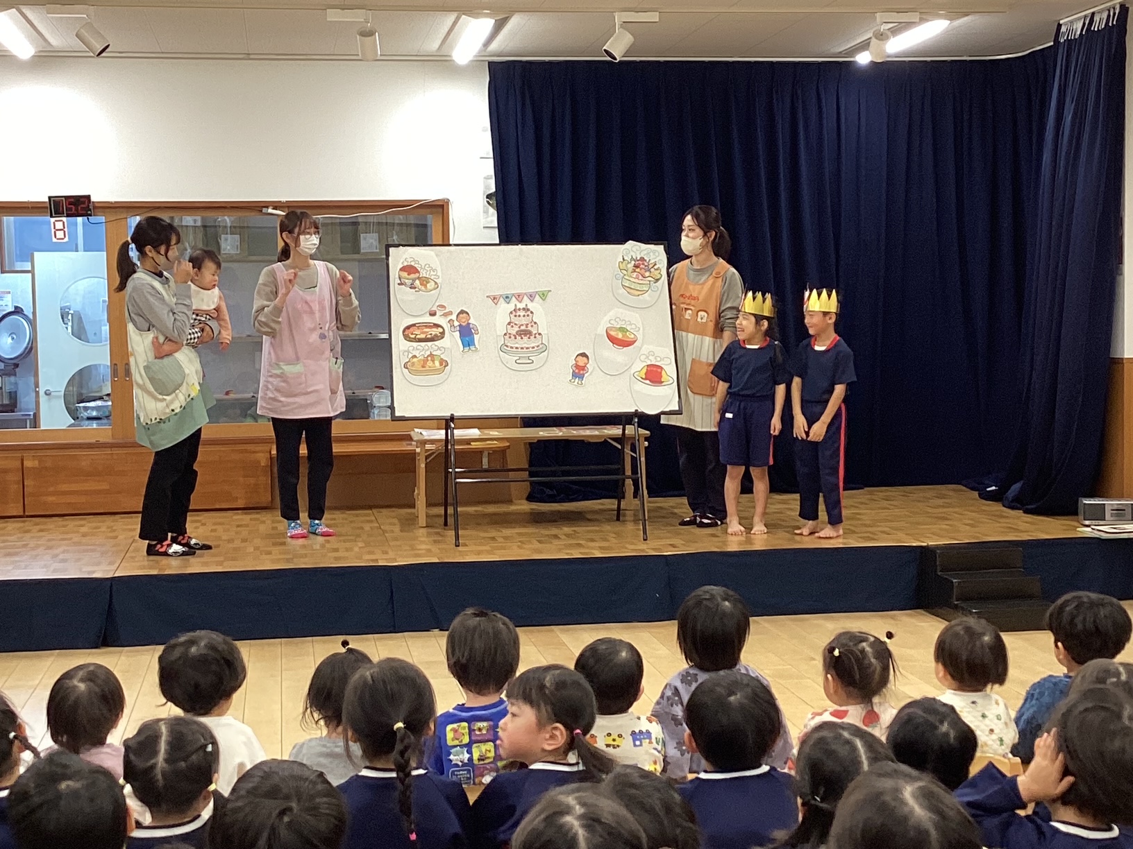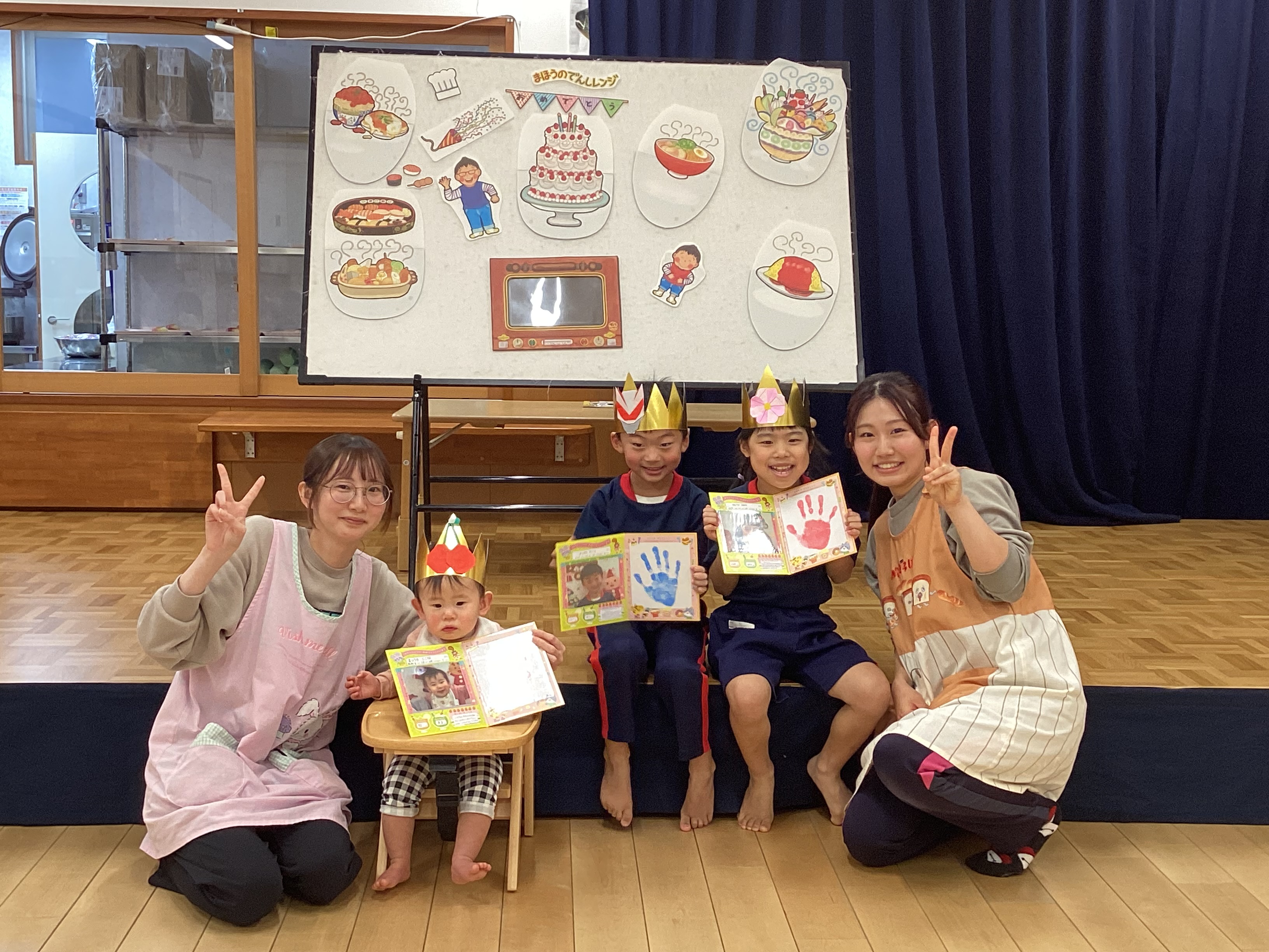先生からの出し物は「ふしぎな電子レンジ」でした^_^ 最後に出来上がったケーキには、誕生児の子が飾りつけをしてくれ、完成しました♪