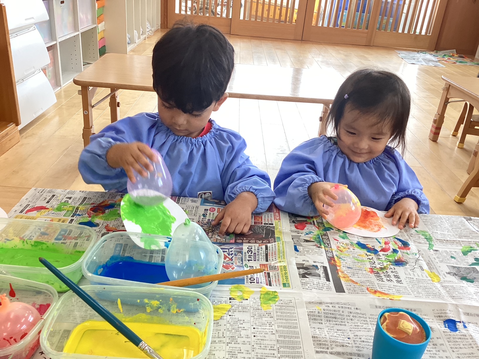 ある制作の一コマ!絵の具の感触を楽しみました。じっと見つめて不思議そうでした。さぁ何ができるかな?