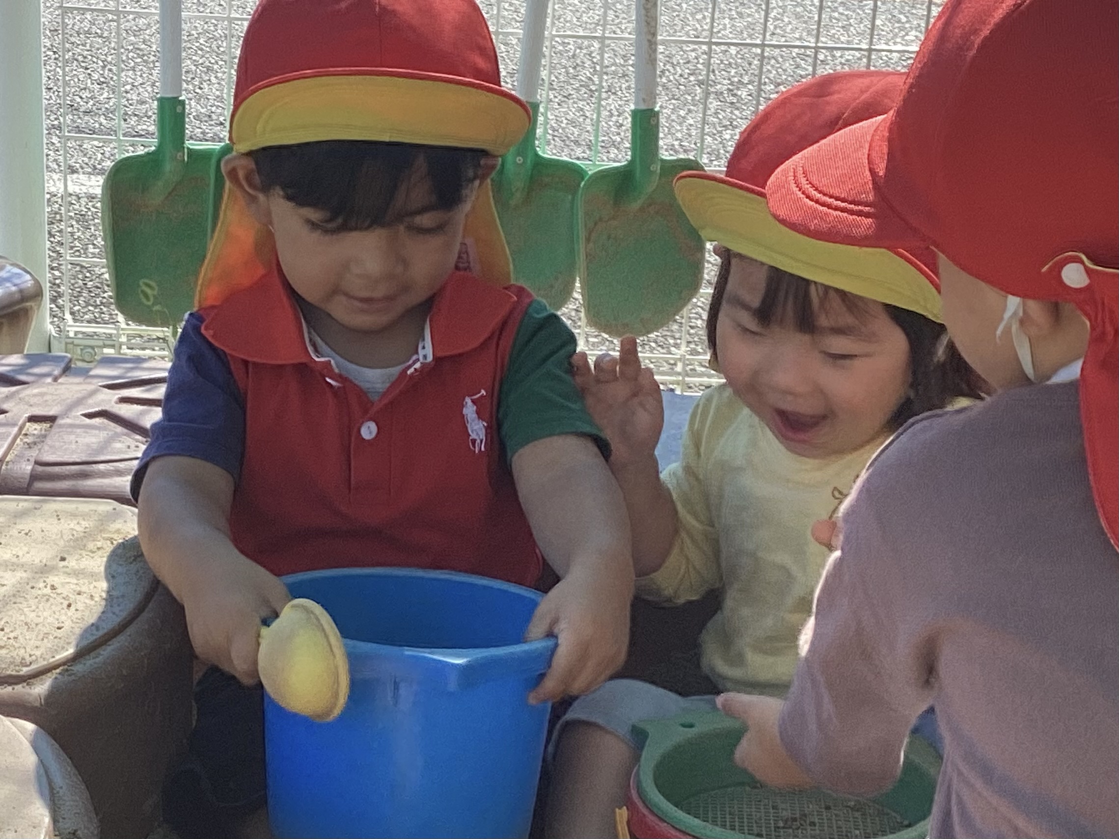 砂場遊びでは、バケツとスコップのセットがブームなちゅうりっぷぐみさん♡ 「いっぱいはいってるねー」楽しく遊んでいます。
