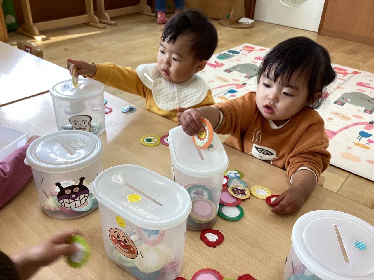 コーナー遊びではパズルに興味を持ってます! はめれたら「できたー!」と喜んで遊んでるよ