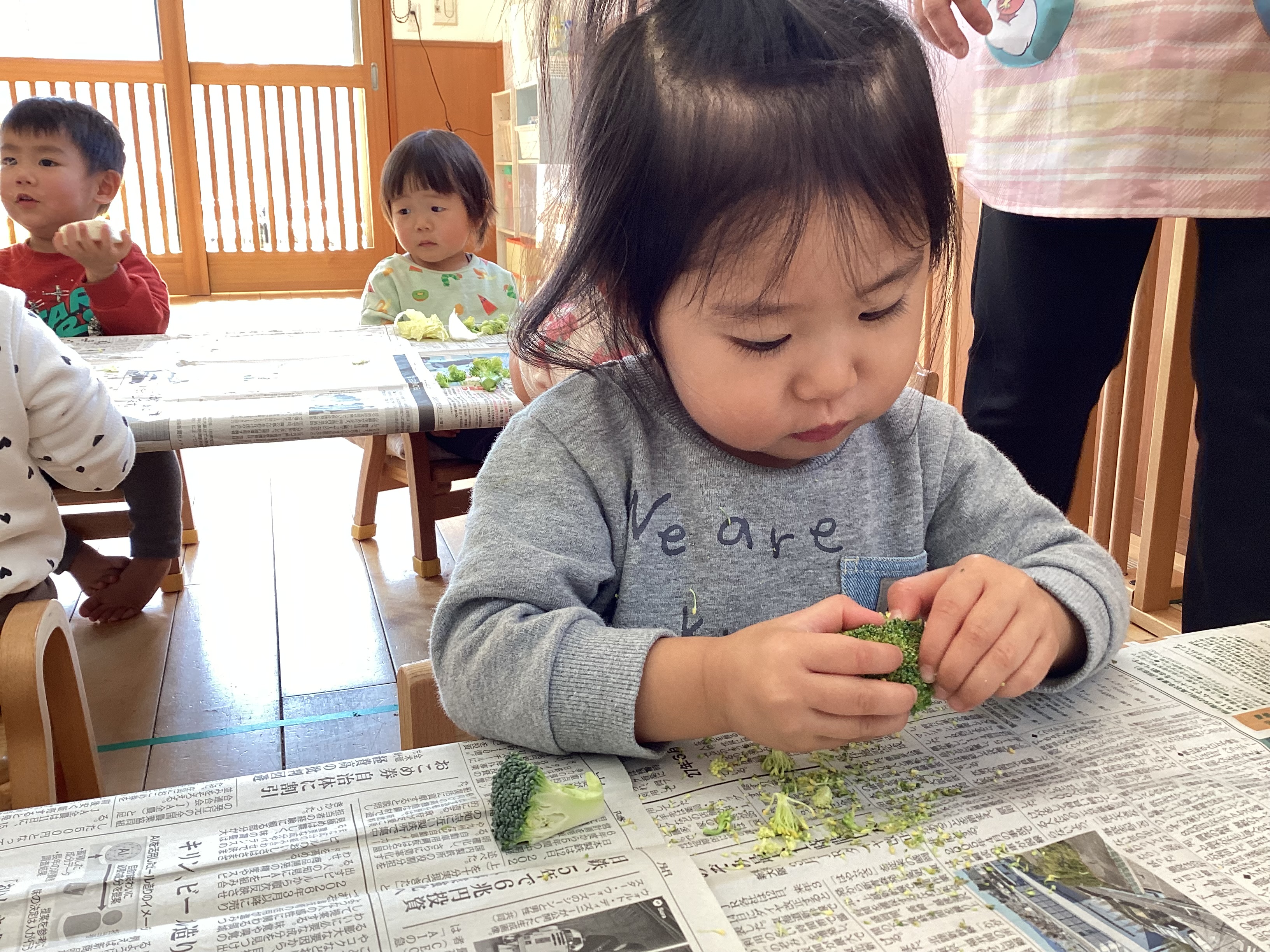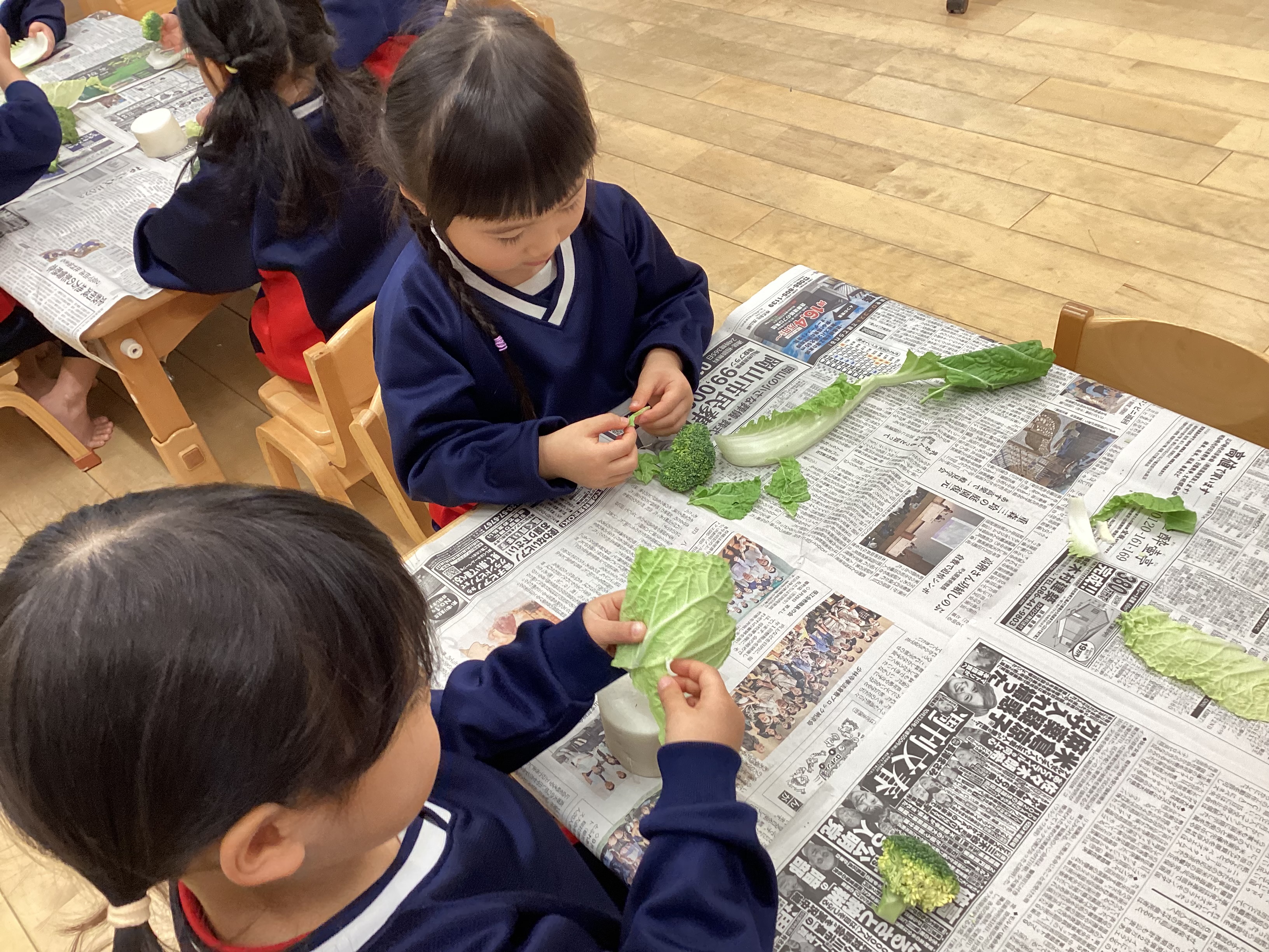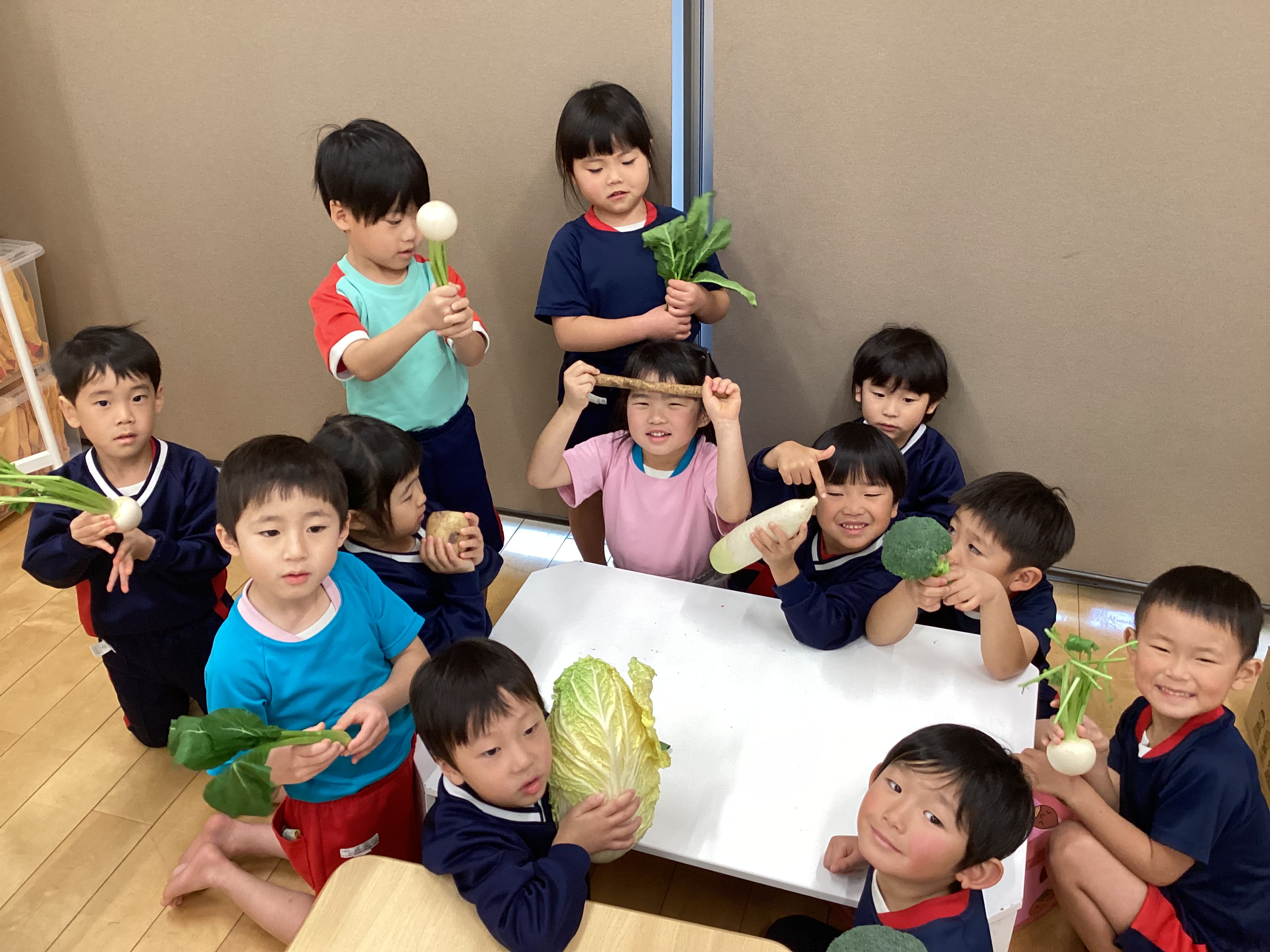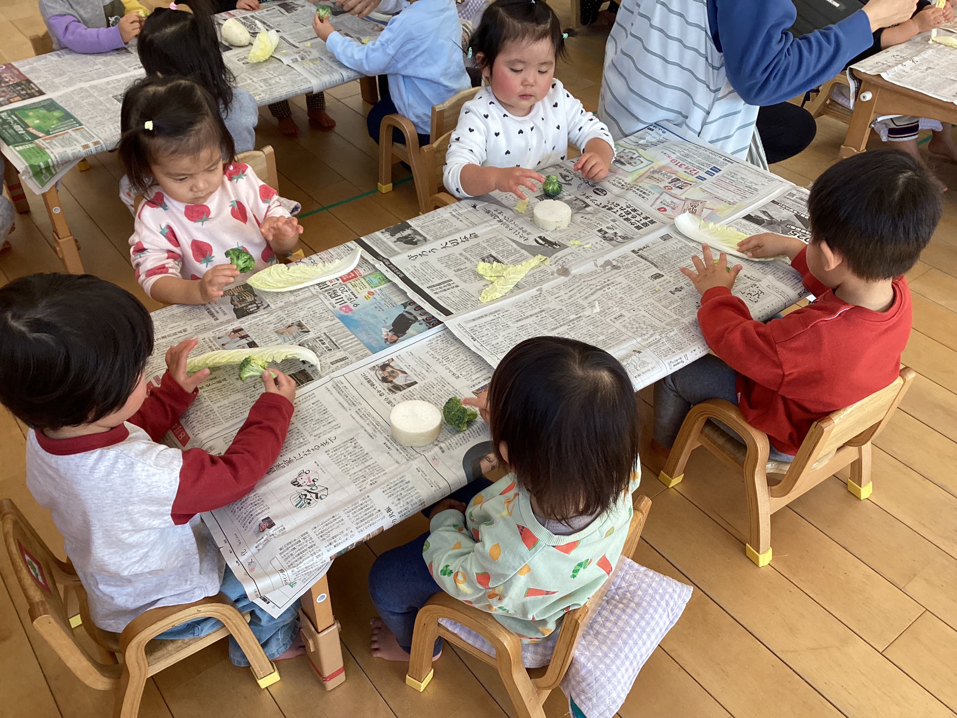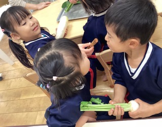 - 野菜を切って断面も見ました。外の色と中の色が違ったり、切り方を変えると見え方が違ったり、断面の模様が綺麗だったりいろいろな発見や気付きがありました。ルールを守り楽しく取り組むことができました。朝ご飯にズッキーニが出る子もいると聞いて驚きました。ご家庭でも夏野菜を畑で育てていたり、食卓に出たり夏野菜を身近に感じてもらえているようで嬉しいです。 まだまだ暑い日が続くので、体を冷やしてくれる効果のある夏野菜をしっかり食べて、暑い夏を乗り切りましょう!