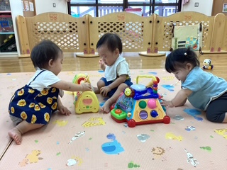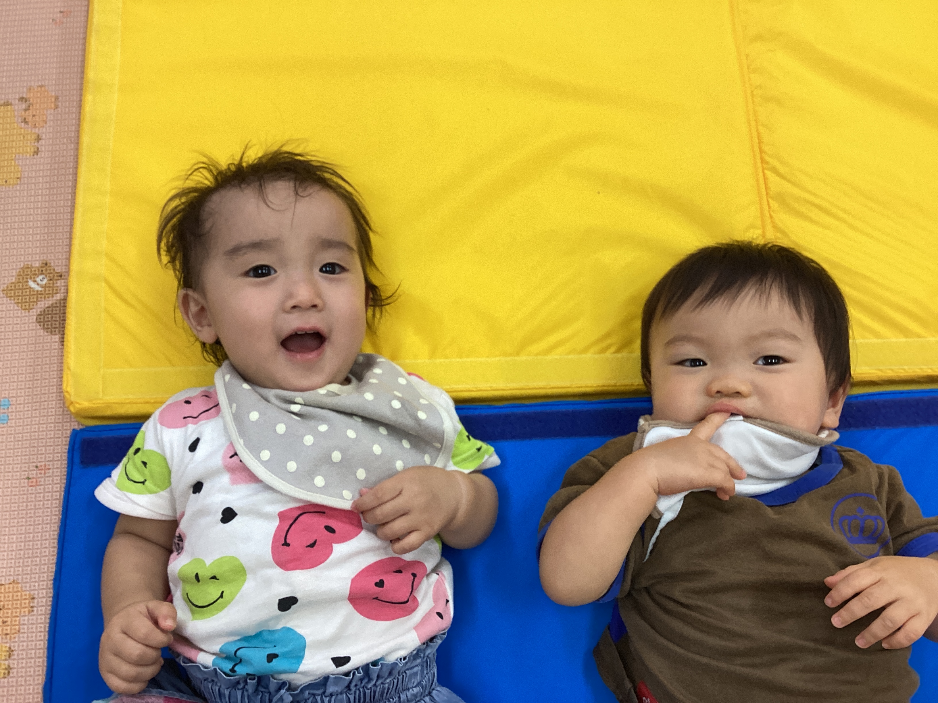 遊戯室で遊んでいると、「あしををのばして〜」と子どもたちだけの体操教室が始まりました♪