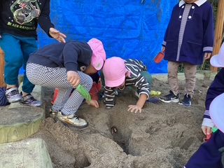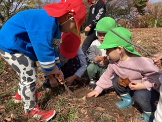 お芋掘りごっこをしたよ。大きなお芋が出てきたね!