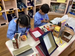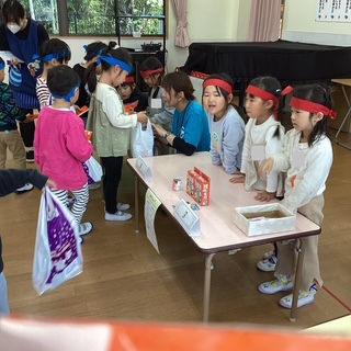 さくら組さんでお店屋さんごっこをしました。「2個ください!」とお金を渡してやりとりを楽しんでいました。