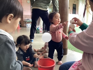 シャボン玉をしたよ。みんなで一緒に「ふ〜!」