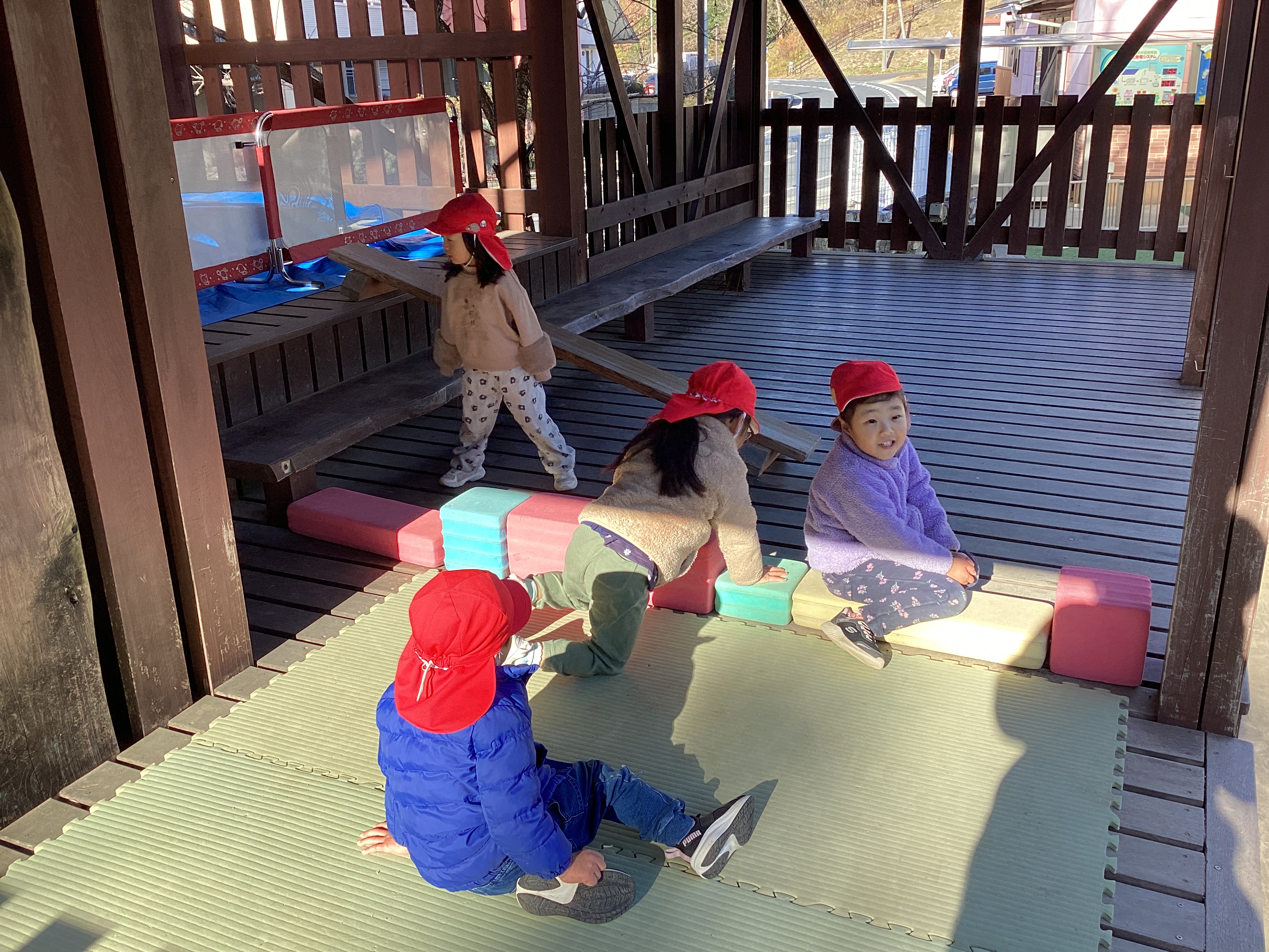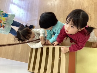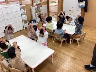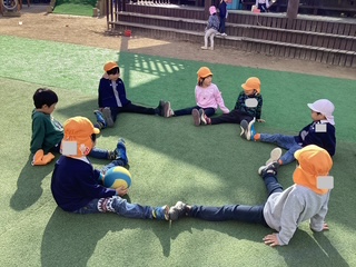 遊戯室で遊んでいると、「あしををのばして〜」と子どもたちだけの体操教室が始まりました♪